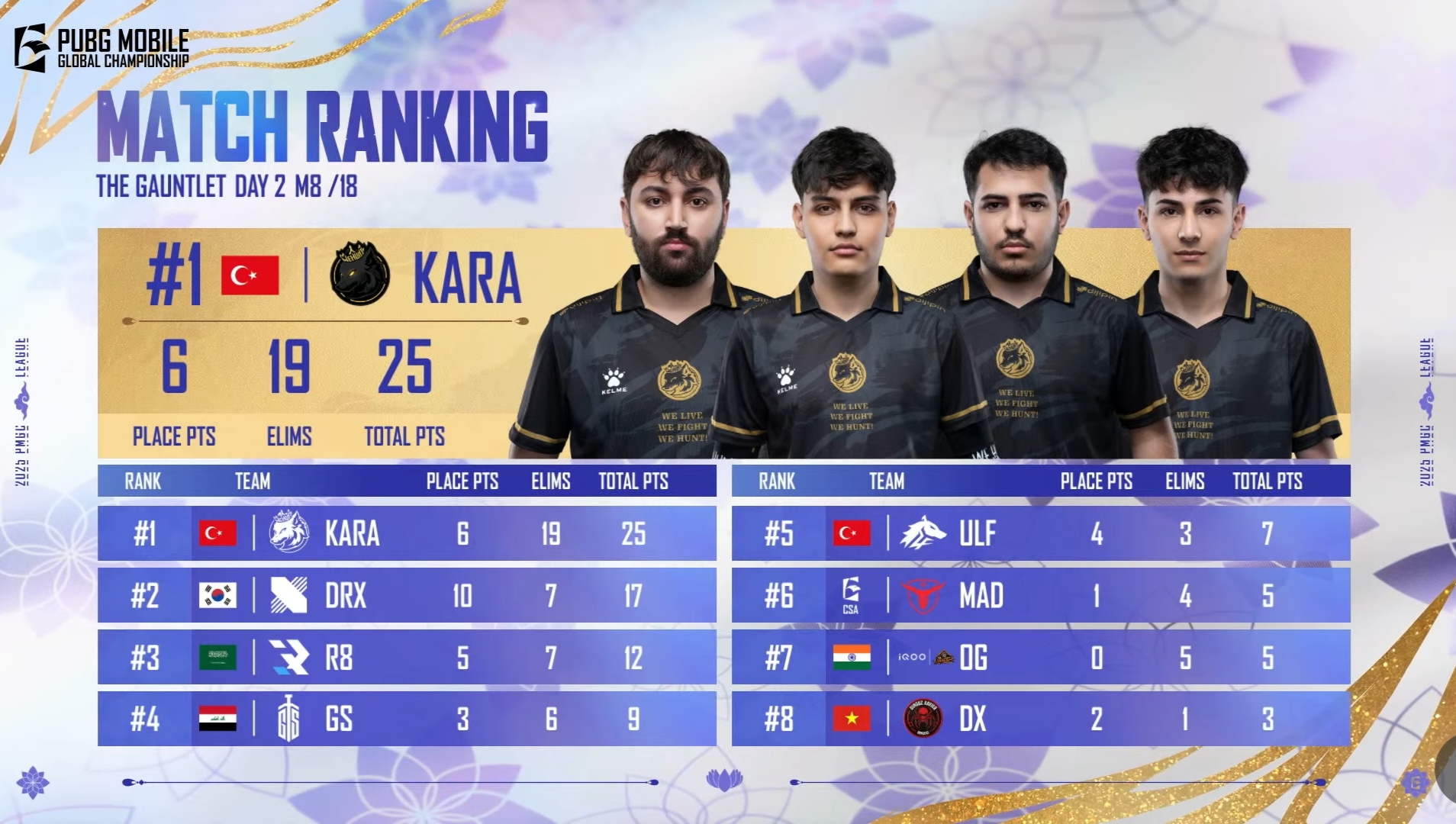 DRX registered its first Chicken Dinner of the PMGC 2025 with 17 points. Kara from Turkey earned 25 points with the help of 19 eliminations. R8 ensured 12 crucial points. Meanwhile, GS and ULF secured nine and seven points, respectively.