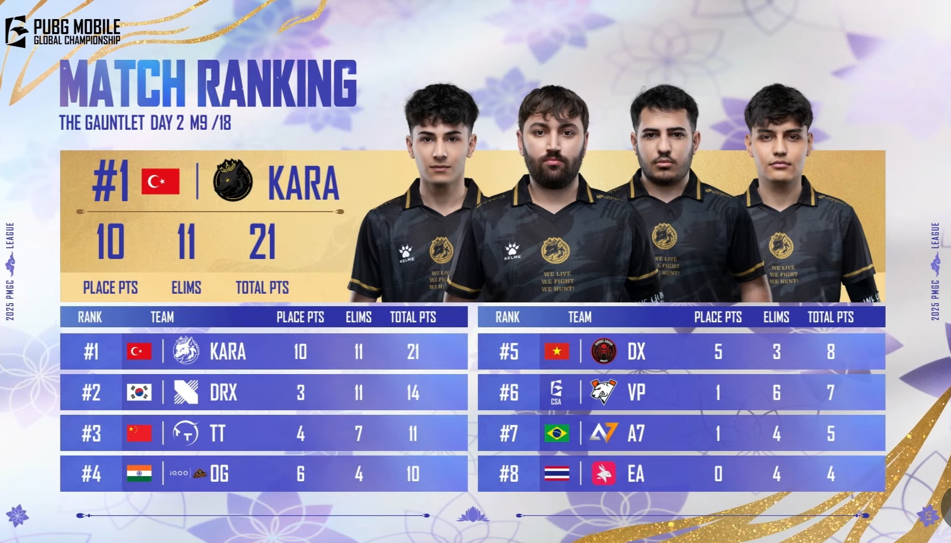 Kara had another impressive game as the team claimed a 21-point Chicken Dinner. DRX and ThumderTalk grabbed 14 and 11 points, respectively. Orangutan accumulated 10 points, including four eliminations.