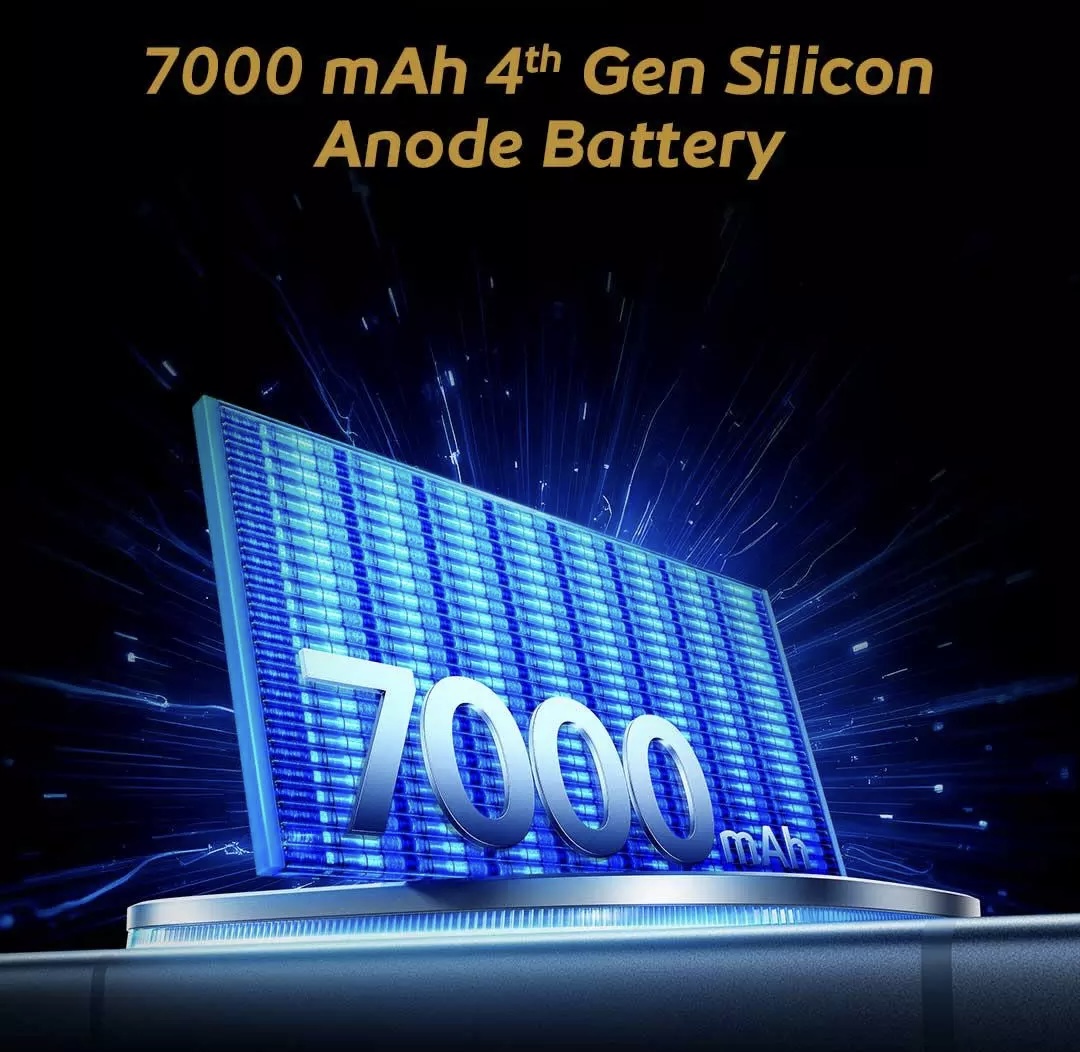• Capacity: A massive 7,000mAh Silicon-Carbon battery packed into a slim ~8.1mm body.