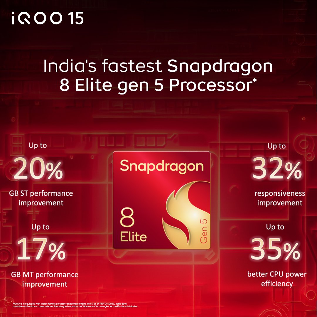 iQOO 15 powered by the latest Qualcomm Snapdragon 8 Elite Gen 5 processor, ensuring smooth, fast performance for all tasks.