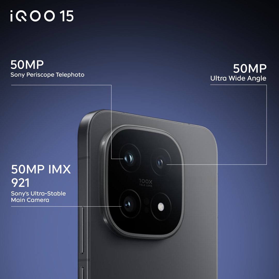iQOO 15 features a versatile triple 50MP rear camera system, including a Sony IMX921 main sensor, an ultrawide lens, and a 50MP Sony IMX882 periscope telephoto lens with 3x optical zoom, delivering detailed photos and strong portrait shots in most conditions.