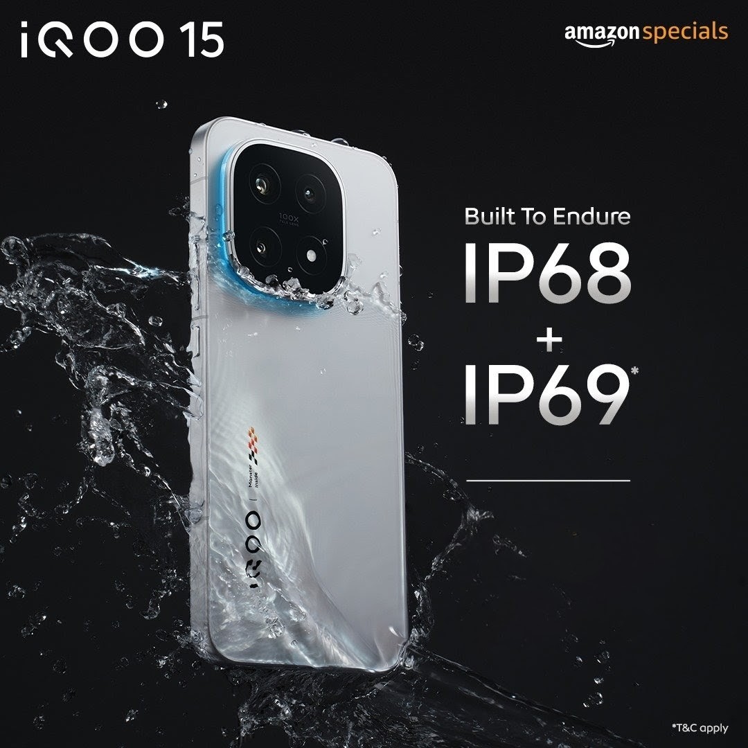 iQOO 15 Features a refined, solid build with an aluminum frame, available in glass or fiberglass backs, and IP68/IP69 water and dust resistance ratings.