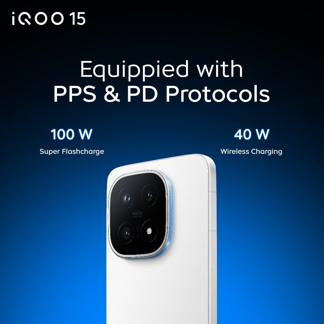 iQOO 15 Supports 100W wired FlashCharge and 40W wireless charging, with the 100W charger included in the box.