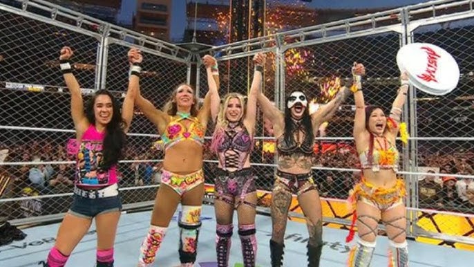 Rhea Ripley, Iyo Sky, Alexa Bliss, Charlotte Flair and AJ Lee were too much for Nia Jax, Lash Legend, Kairi Sane, Asuka and Becky Lynch, leading to their victoryNia Jax made her entrance, immediately establishing her dominance as the momentum shifted in her favor against her opponents. Rhea Ripley and Lash Legend followed her into the ring, with Ripley wearing a mask resembling the "Terrifier" character due to a broken nose she sustained in a match last month.