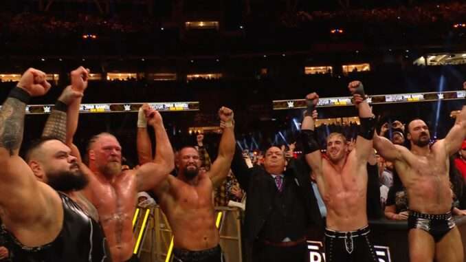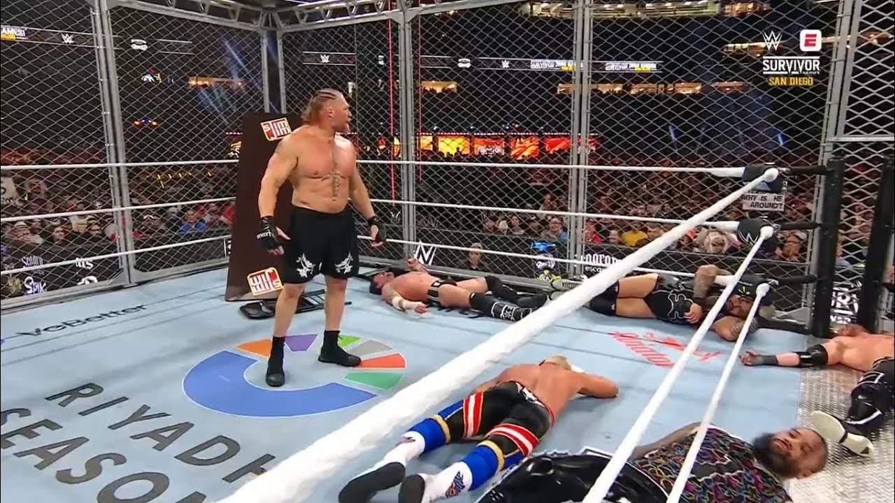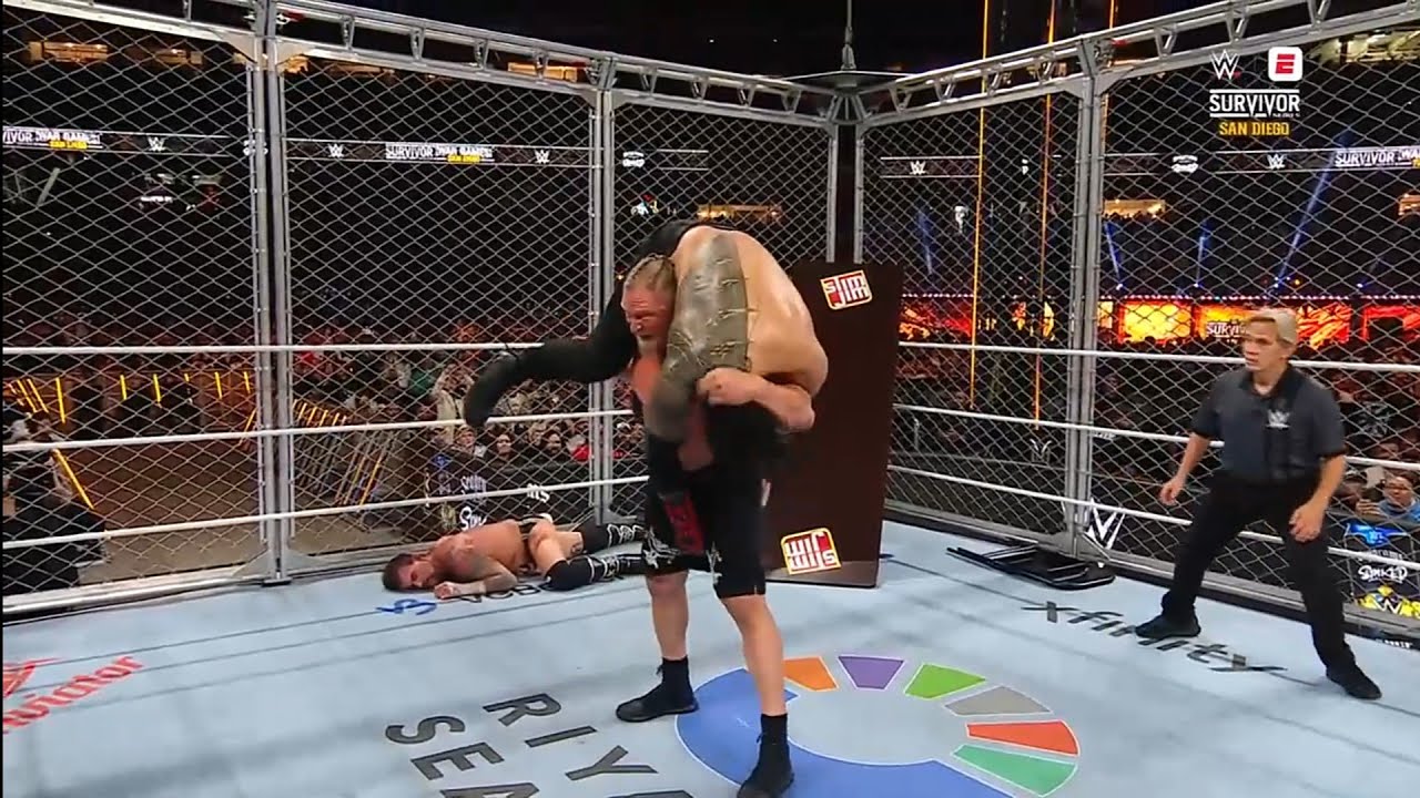 Brock Lesnar easily tosses Roman Reigns onto a table and drags him into the ring as he continues to dominate Reigns while all the wrestlers are now in the ring.Logan Paul is met with boos after he brings out the brass knuckles, but even with the advantage, Roman Reigns drops Paul and claims the brass knuckles.Just as the fight was over, a mystery man entered the cage and helped Bronson Reed, Bron Breakker, Logan Paul, Drew McIntyre and Brock Lesnar defend Cody Rhodes, CM Punk, Jey Uso, Jimmy Uso and Romen Reigns.