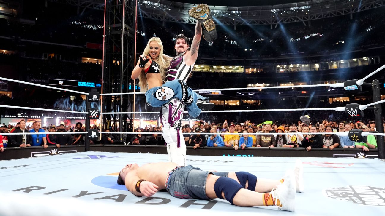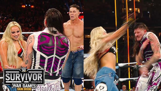 Dominik, being checked on by the medical team, rushed into the ring to hit the 619 and a frog splash. However, the official, irked by the shenanigans, refused to count and kicked Perez and Raquel from ringside. This helped Cena regain his footing in the match until Finn Balor and JD McDonagh arrived to aid Dirty Dom. Cena countered both Balor and McDonagh, picking them up to deliver a double AA.Dominik tried to capitalize, bringing in the title, but Cena ducked to hit another AA, but the referee was taken out earlier accidentally by Cena when Mysterio ducked a shoulder tackle. Liv Morgan suddenly appeared, making her return to slap Dirty Dom. Morgan then leapt into Cena’s arms before low-blowing him. Dominik followed with a 619, and Morgan finished the attack by striking Cena with the title.