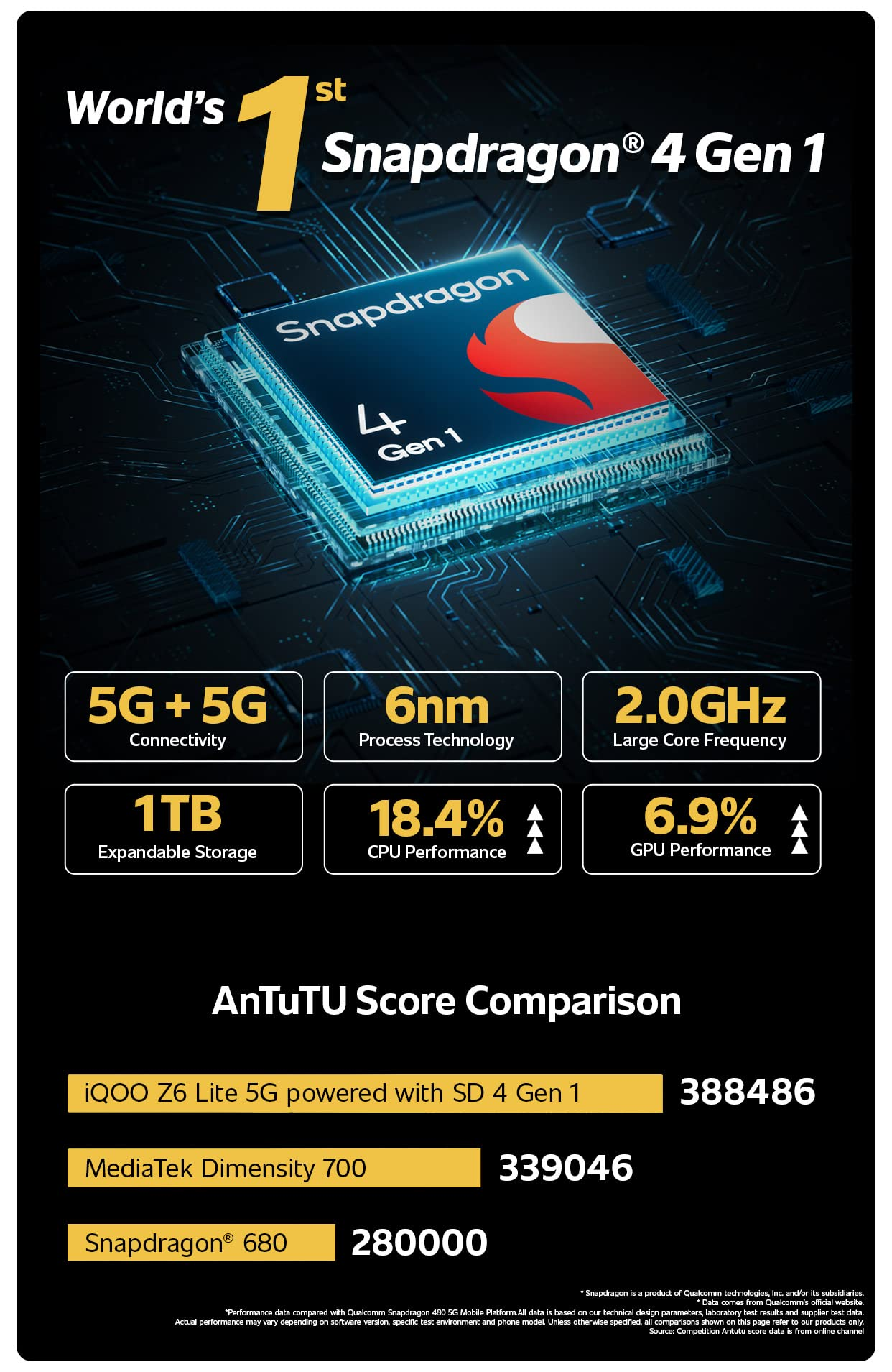 The underlying chip is the main takeaway. The first phone in the world to use Qualcomm's latest Snapdragon 4 Gen 1 chipset is the iQOO Z6 Lite. According to published statistics, the performance over Qualcomm Snapdragon 480 will be up to 18% faster, as will the graphics.