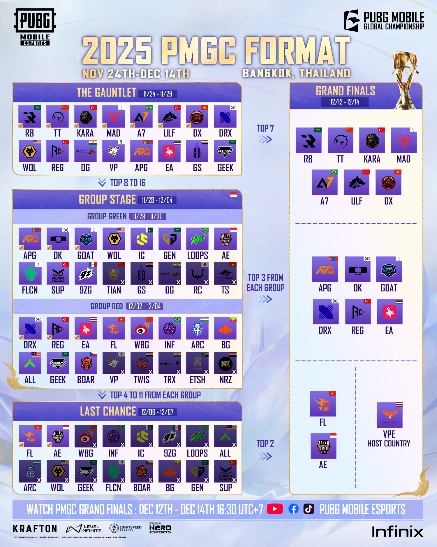 The Grand Finals of the PUBG Mobile Global Championship (PMGC) 2025 will be held from December 12 to 14, 2025, and all 16 finalists have been confirmed. The tournament's League Stage was held in three phases: Gauntlet, Group Stage, and Last Chance Qualifiers. A total of 39 teams contested in this stage from November 24 to December 7.
