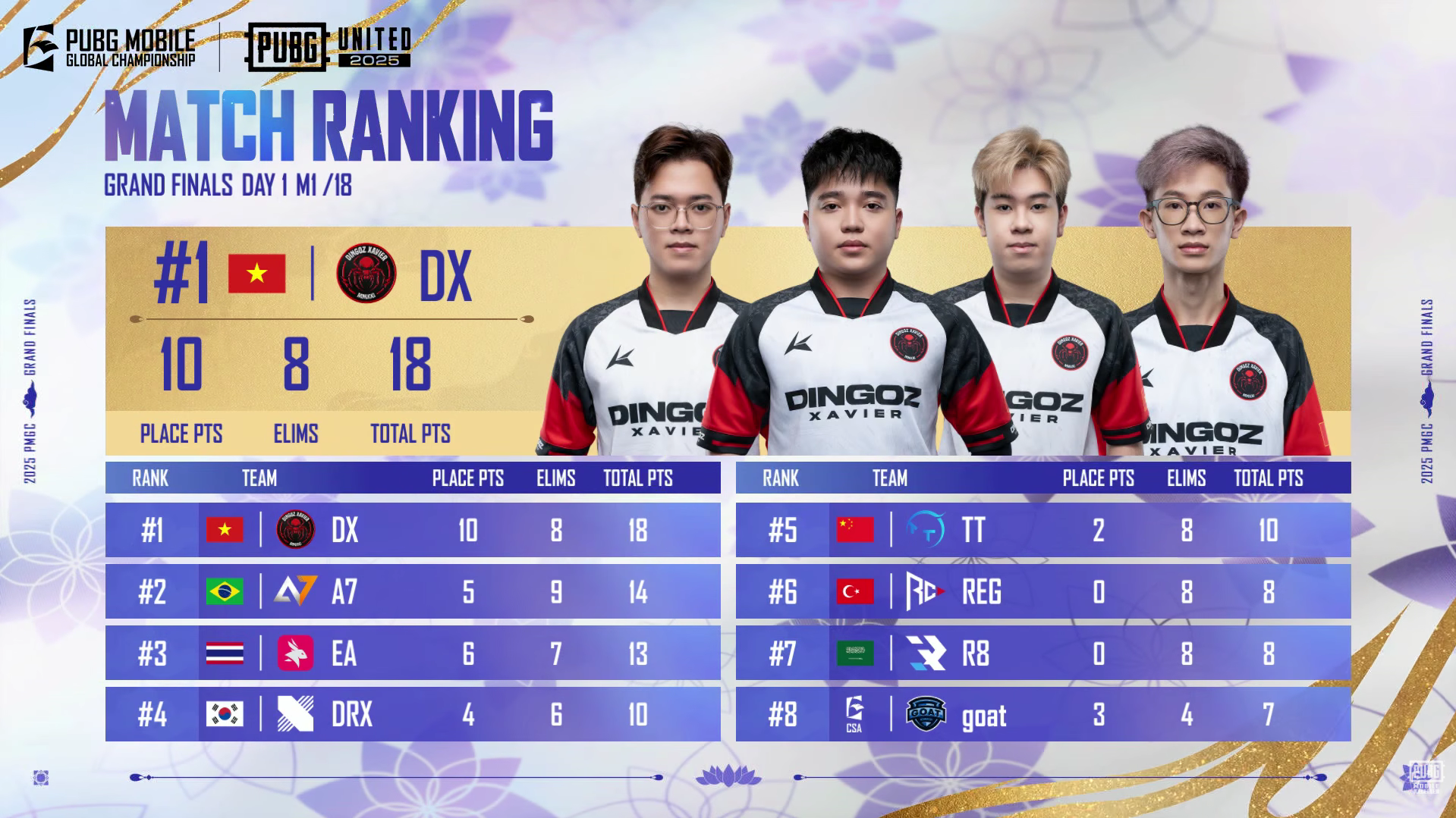 DX (D'Xavier) secured a critical victory in the opening match, demonstrating perfect rotations and composure in the final zone. They start their Grand Finals campaign with a strong point total: