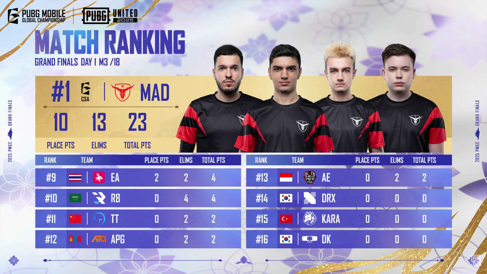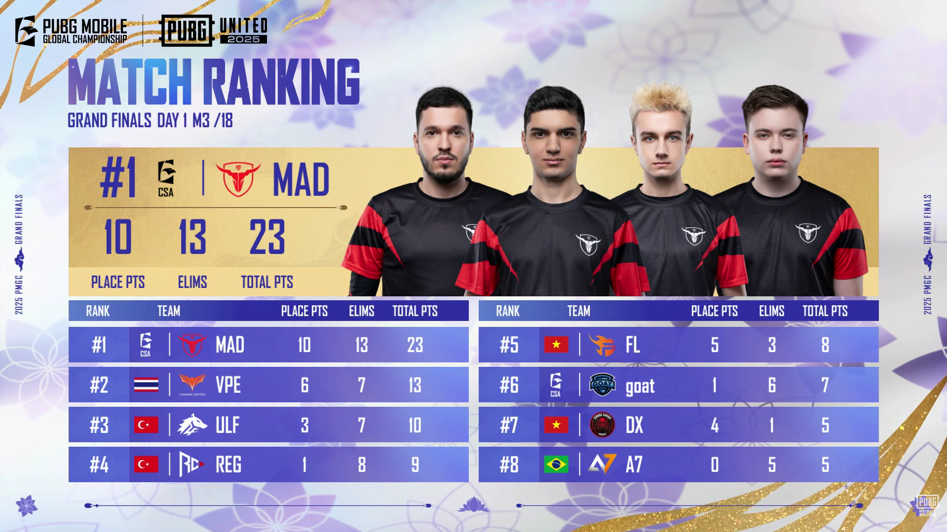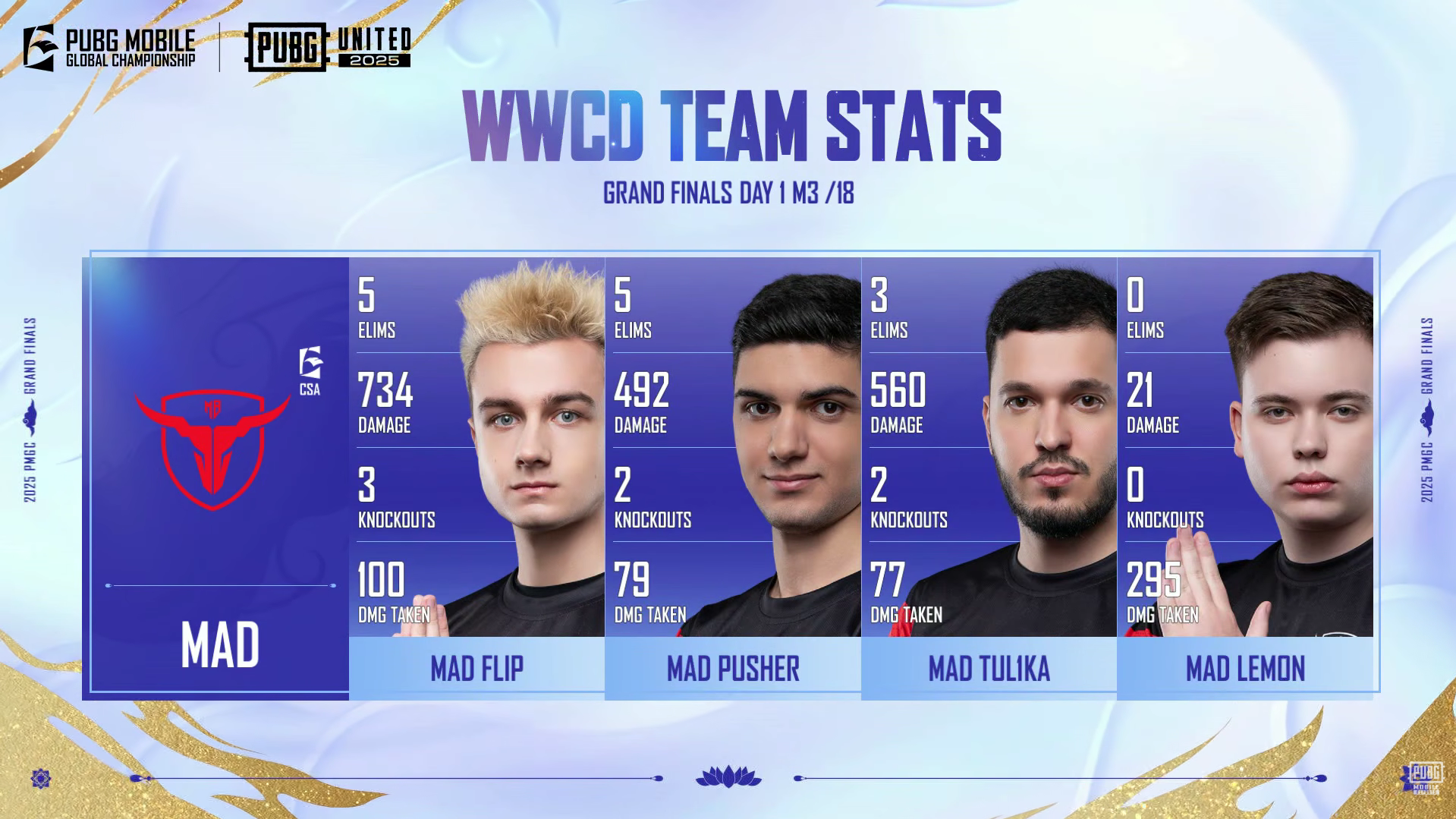 MAD (MADBULLS) secured their first Winner Winner Chicken Dinner (WWCD) of the Grand Finals with overwhelming firepower. Their high elimination count resulted in one of the biggest point hauls of the day: