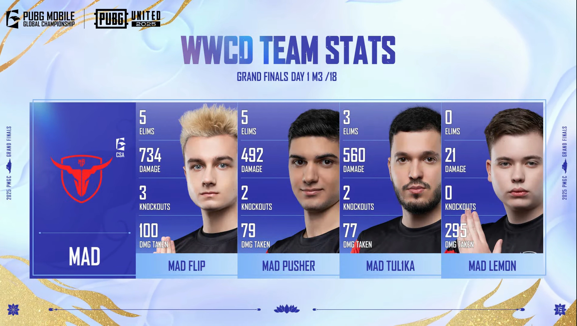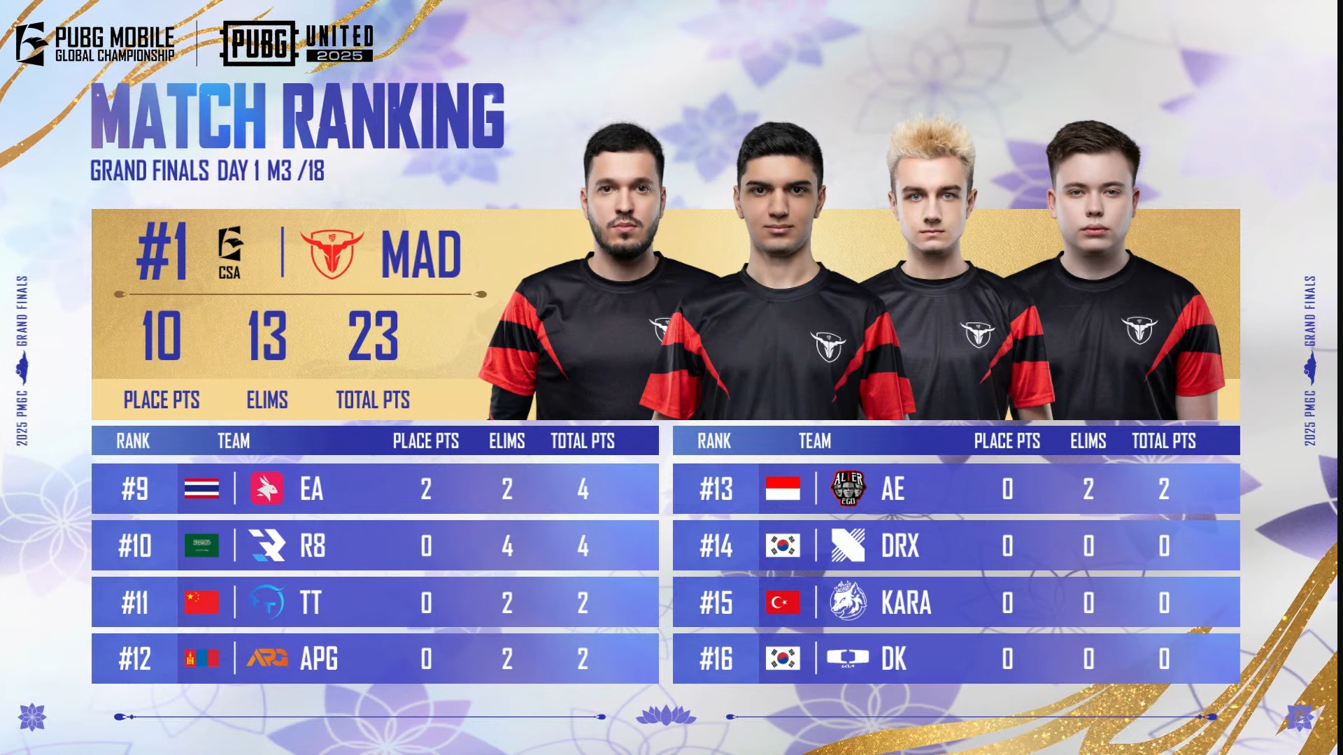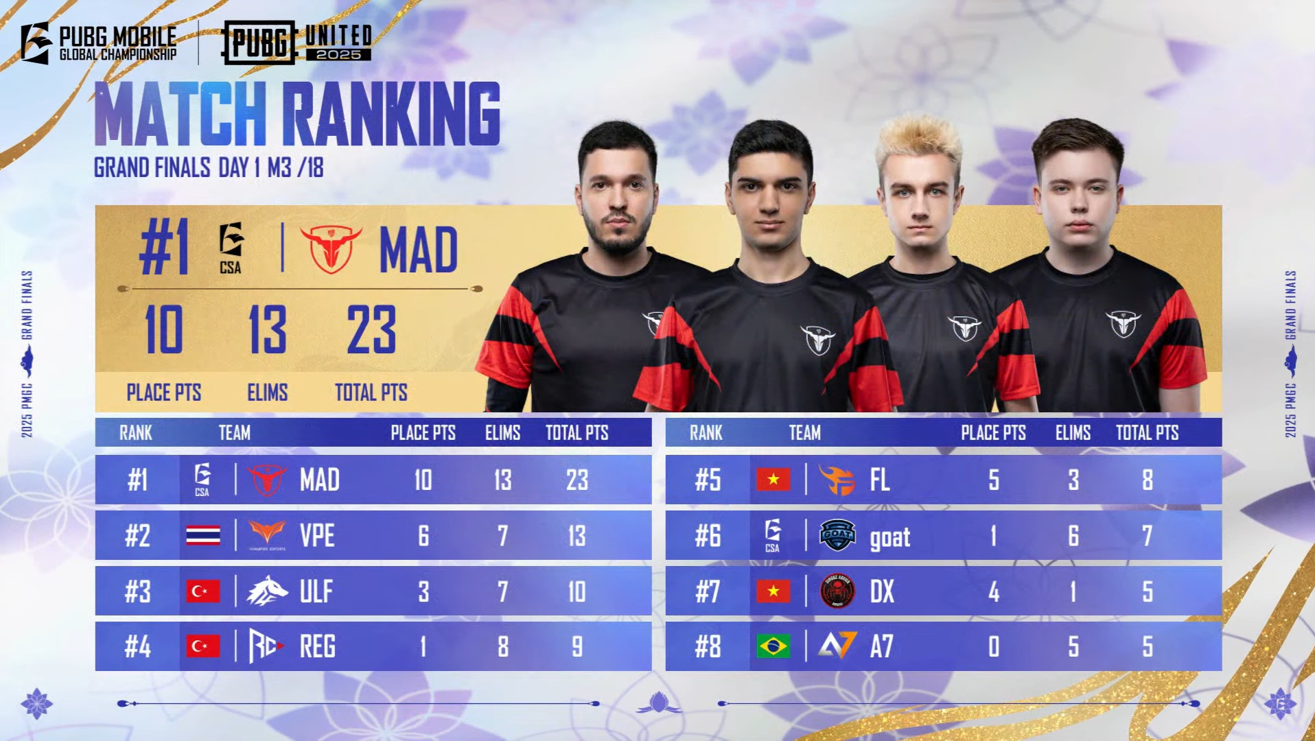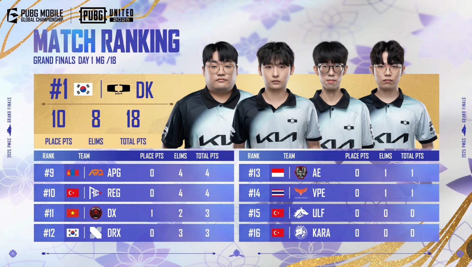 Alpha7 Esports grabbed fourth place with 45 points, including 30 eliminations. Madbulls and R8 Esports ranked fifth and sixth with 42 and 39 points, respectively. ThunderTalk from China was eighth with 36 points, while Regnum had an average run, scoring 35 points. Dplus and Vampire accumulated 25 points each. Kara from Turkey had a terrible opening, as the side was 16th with only 14 points.