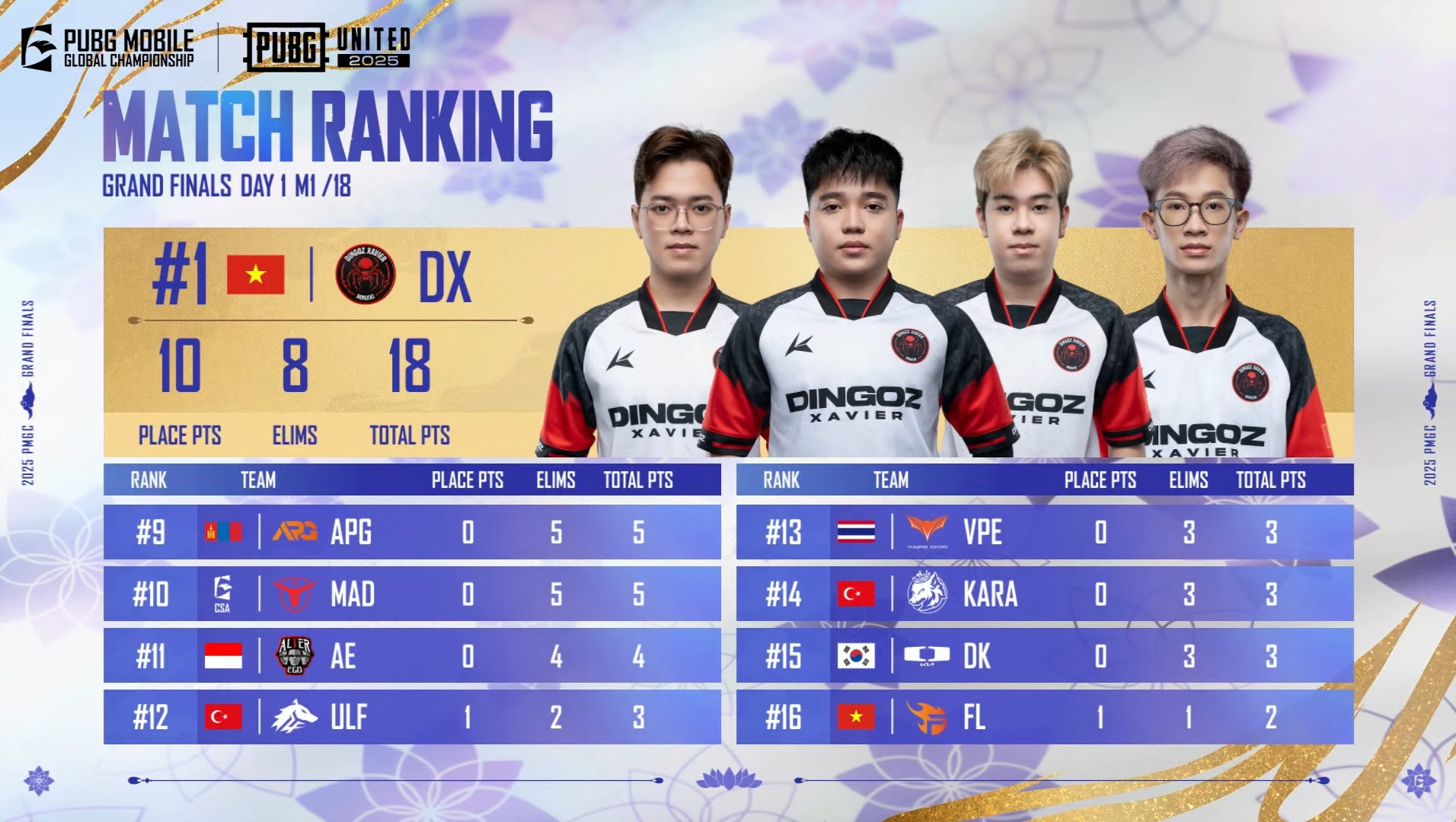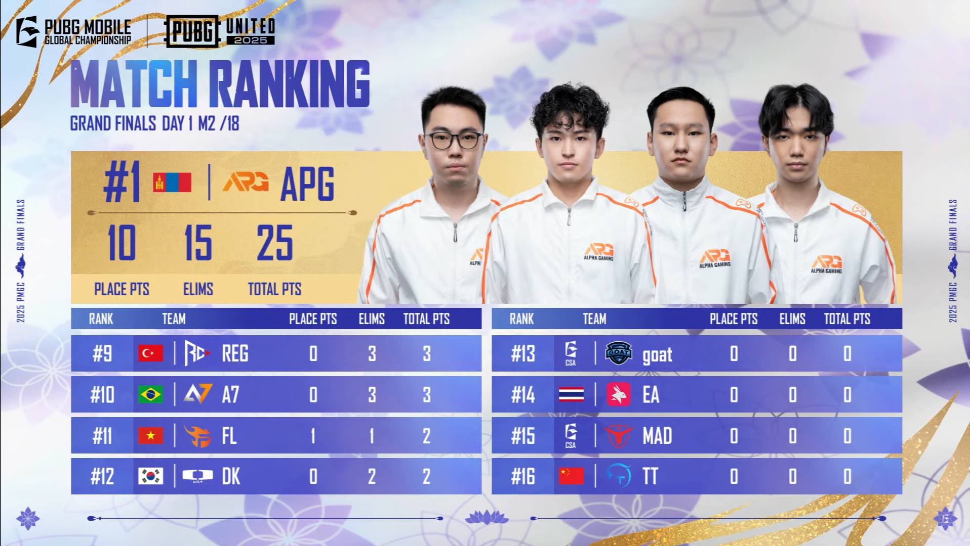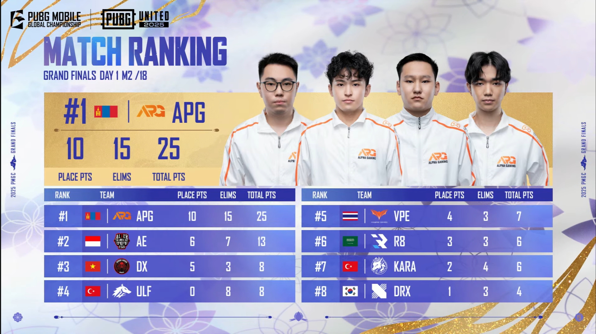 Alpha Gaming from Mongolia secured a huge 25- point Chicken Dinner. Alter Ego earned 13 points, while D’Xavier and ULF scored eight points each. Vampire Esports added seven points to their tally.
