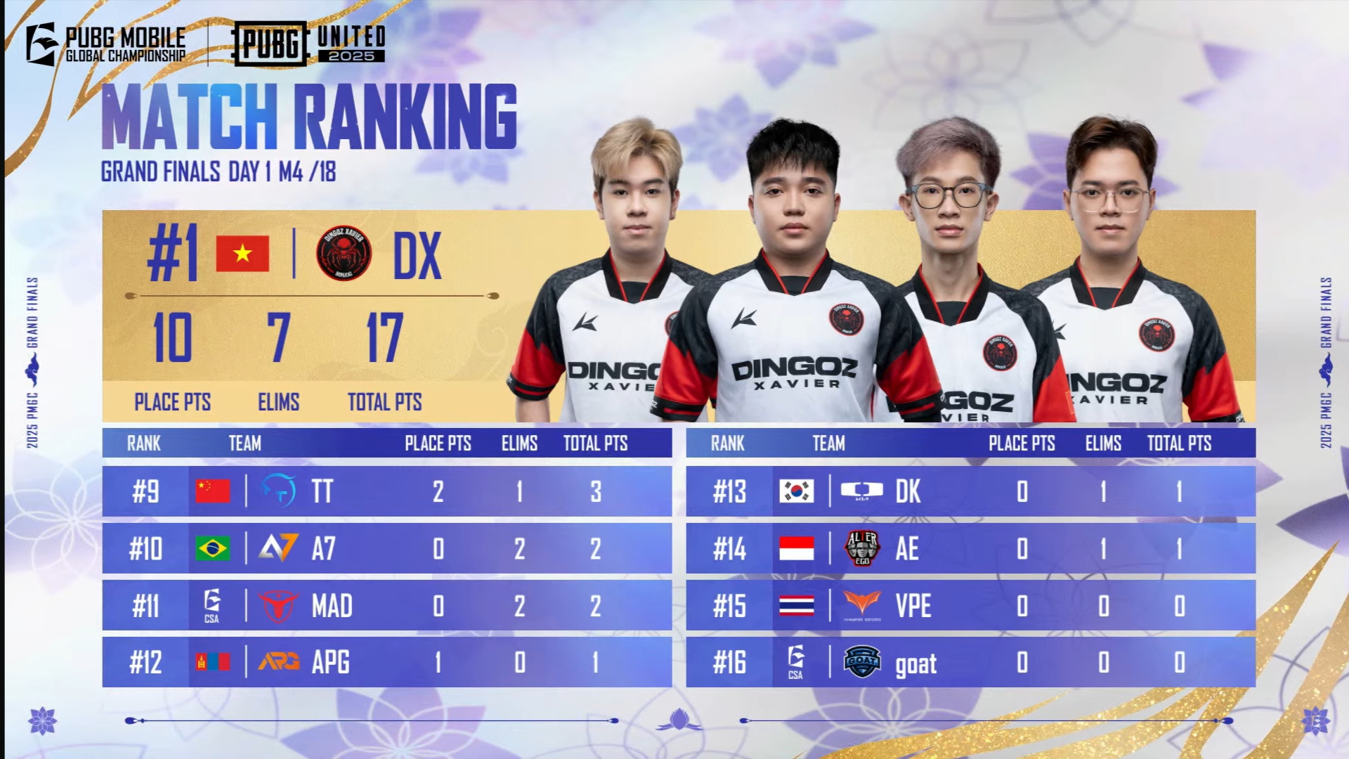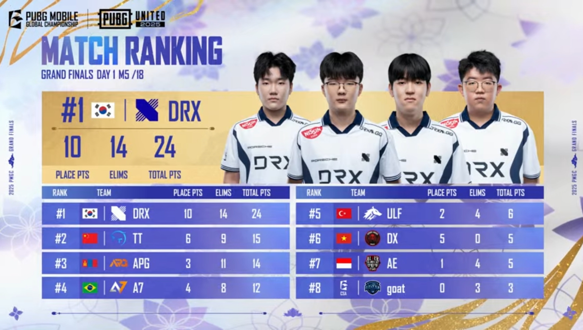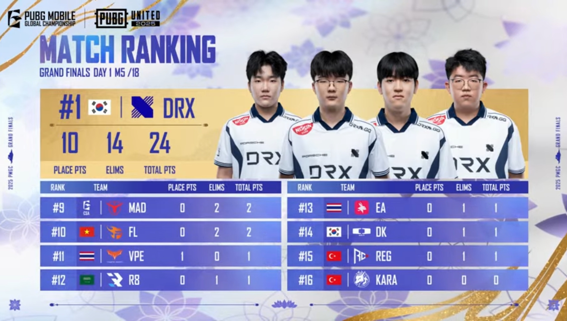 The opening day of the PUBG Mobile Global Championship (PMGC) 2025 Grand Finals was held on December 12. D’Xavier emerged as the top performer with 56 points and two Chicken Dinners. Alpha Gaming came second with 51 points and one Chicken Dinner, while DRX ensured third position with 50 points and one Chicken Dinner.