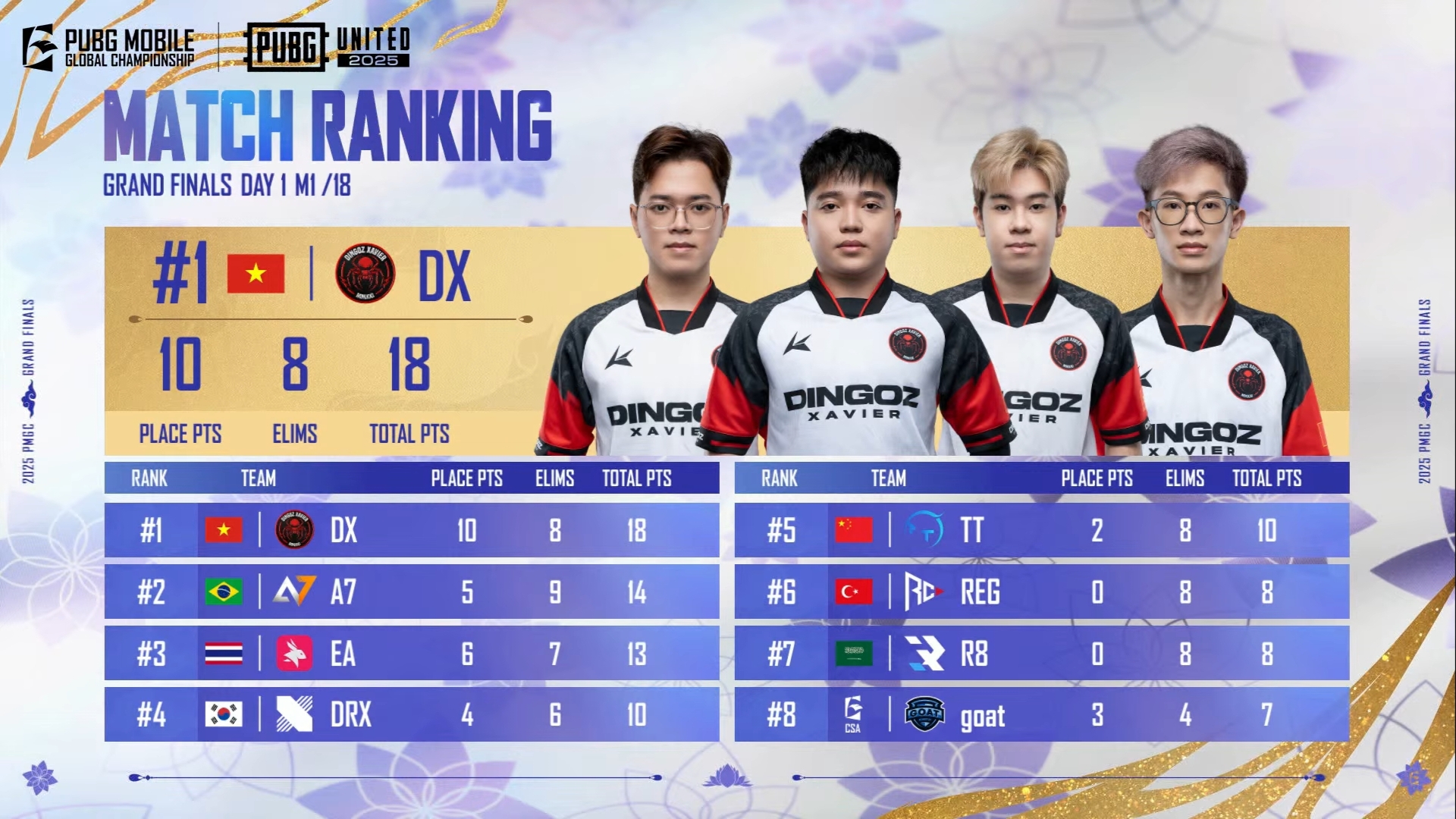 D’Xavier from Vietnam displayed amazing performances in the opening game of the PMGC Finals and secured an 18-point Chicken Dinner. Alpha7 Esports and EArena added 14 and 13 points to their respective tallies. DRX and ThunderTalk grabbed 10 points each.