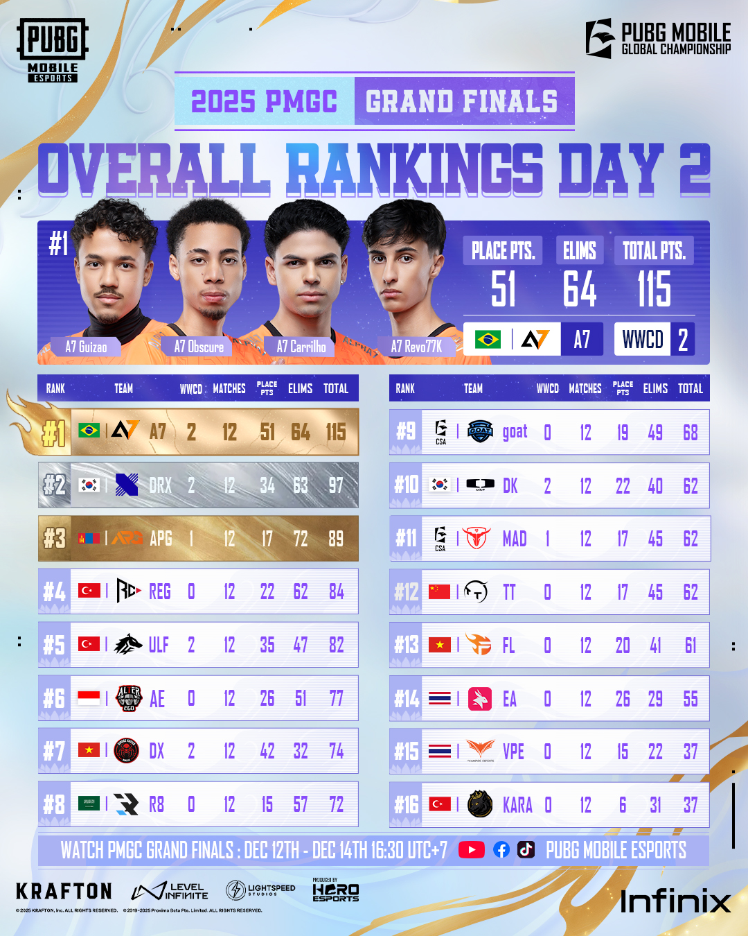 Day 2 of the PUBG Mobile Global Championship (PMGC) 2025 Grand Finals was conducted on December 13. Alpha7 Esports from Brazil moved to first with 115 points and two Chicken Dinners. The squad won back-to-back two matches on Day 2 and finished top in the overall points table. The team has accumulated 64 eliminations in 12 games.