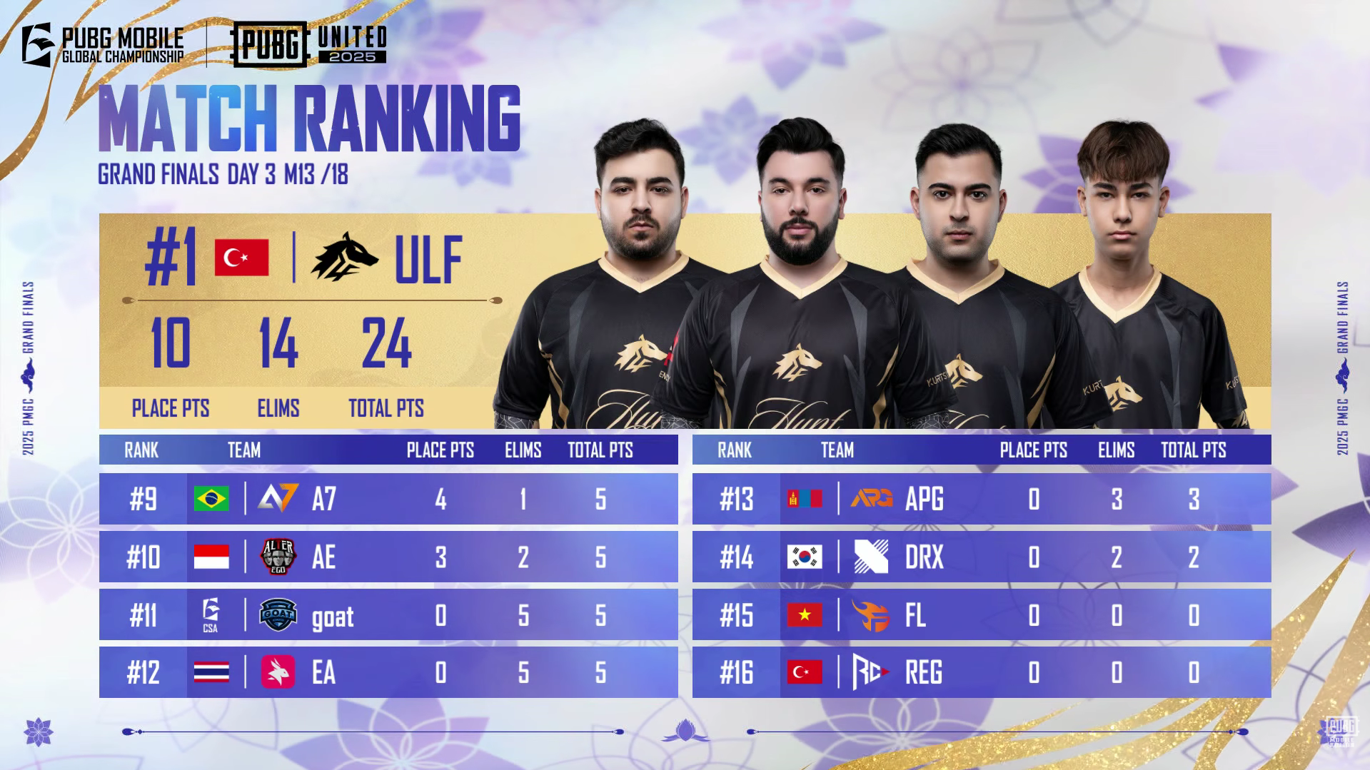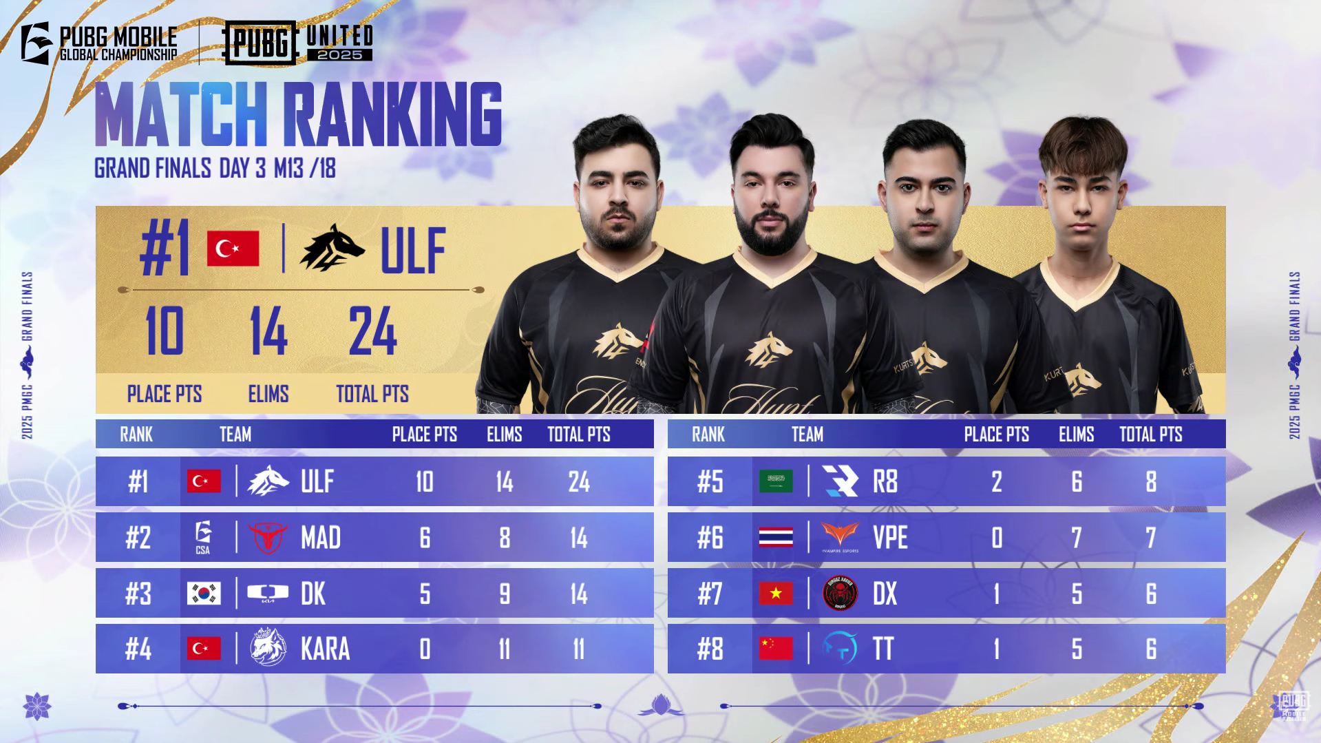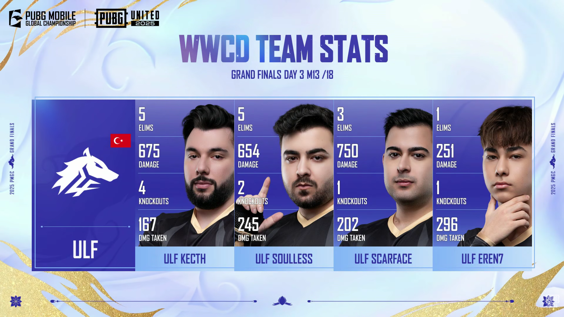 ULF secured an impressive 14 eliminations, demonstrating strong teamwork in the final engagements.