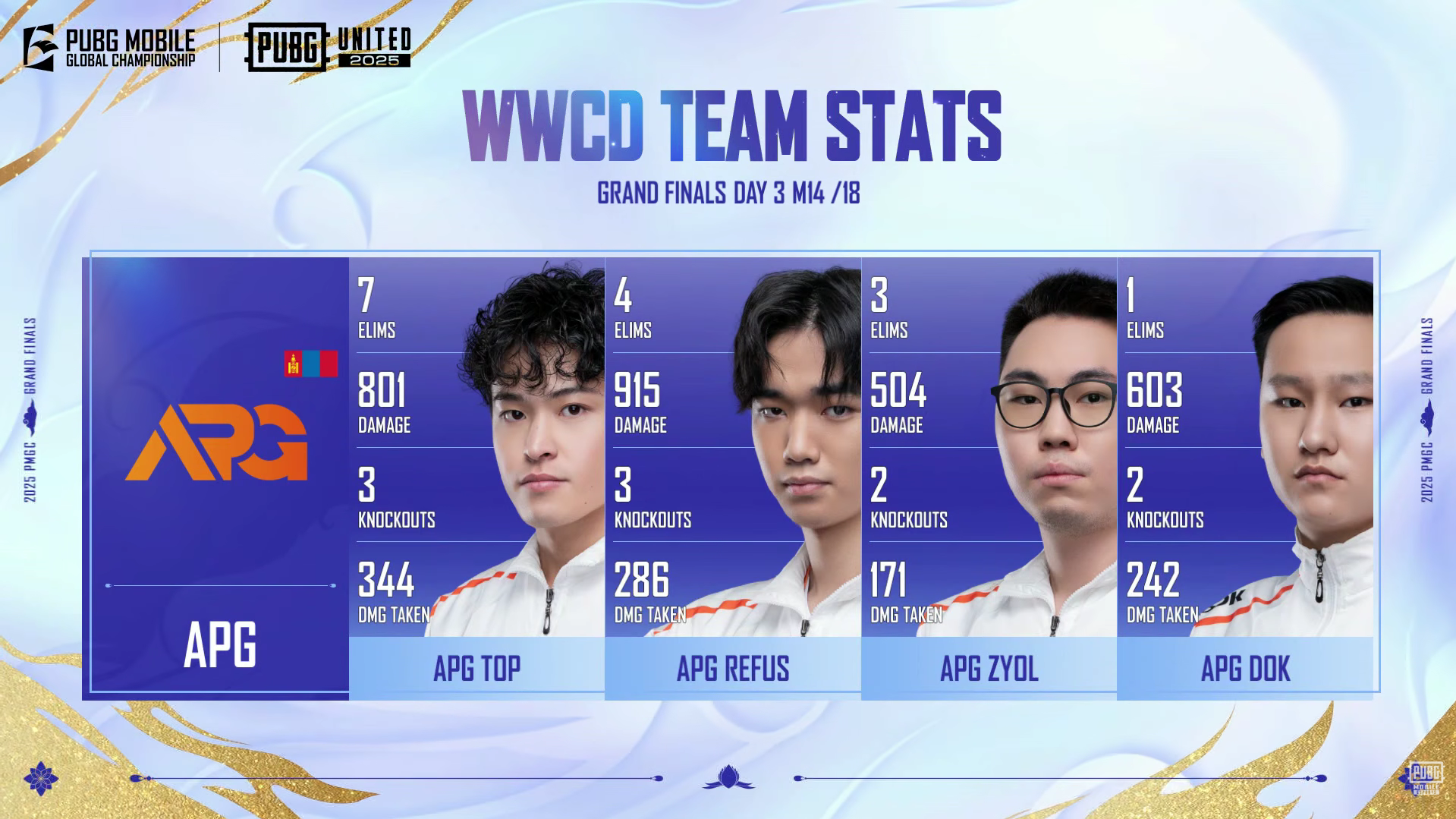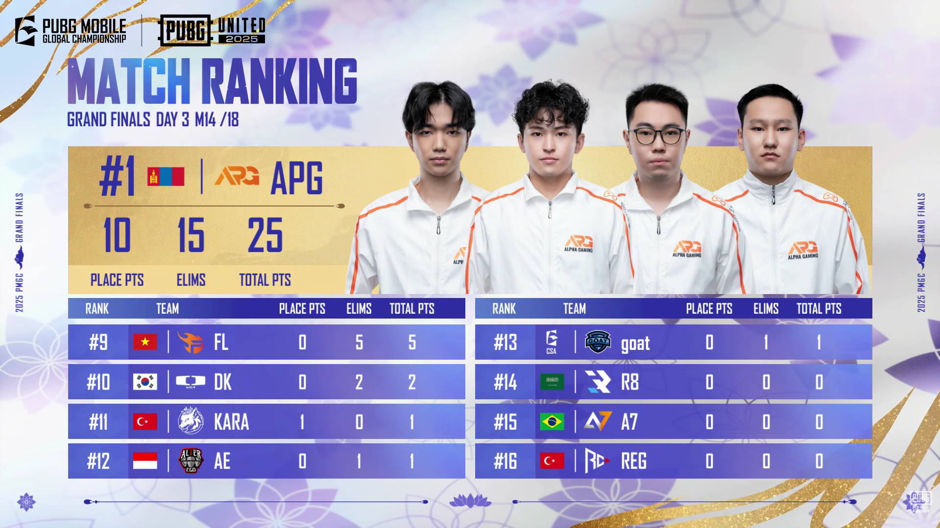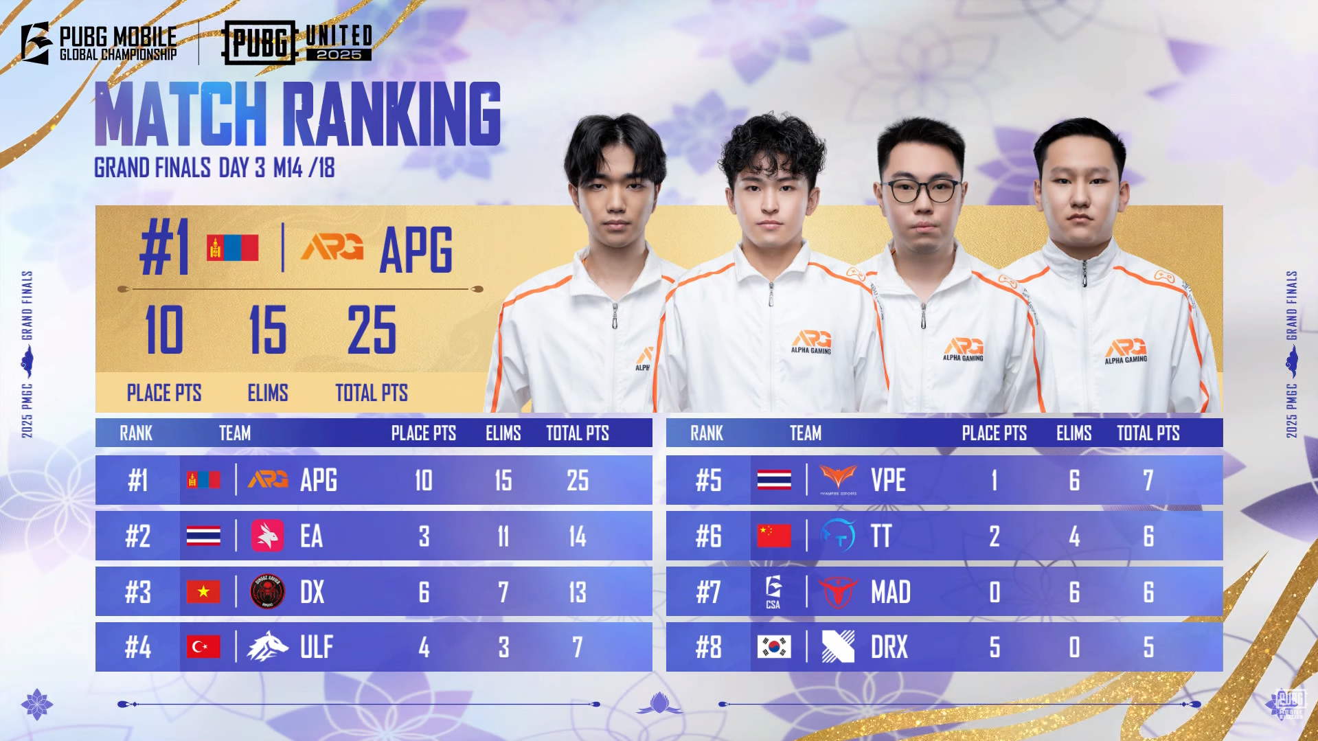 The second match of the final day (Match 14) of the PUBG Mobile Global Championship (PMGC) 2025 Grand Finals, played on Erangel, saw the Mongolian squad, Alpha Gaming (APG), secure a massive Winner Winner Chicken Dinner (WWCD) to immediately put themselves in Match Point range!