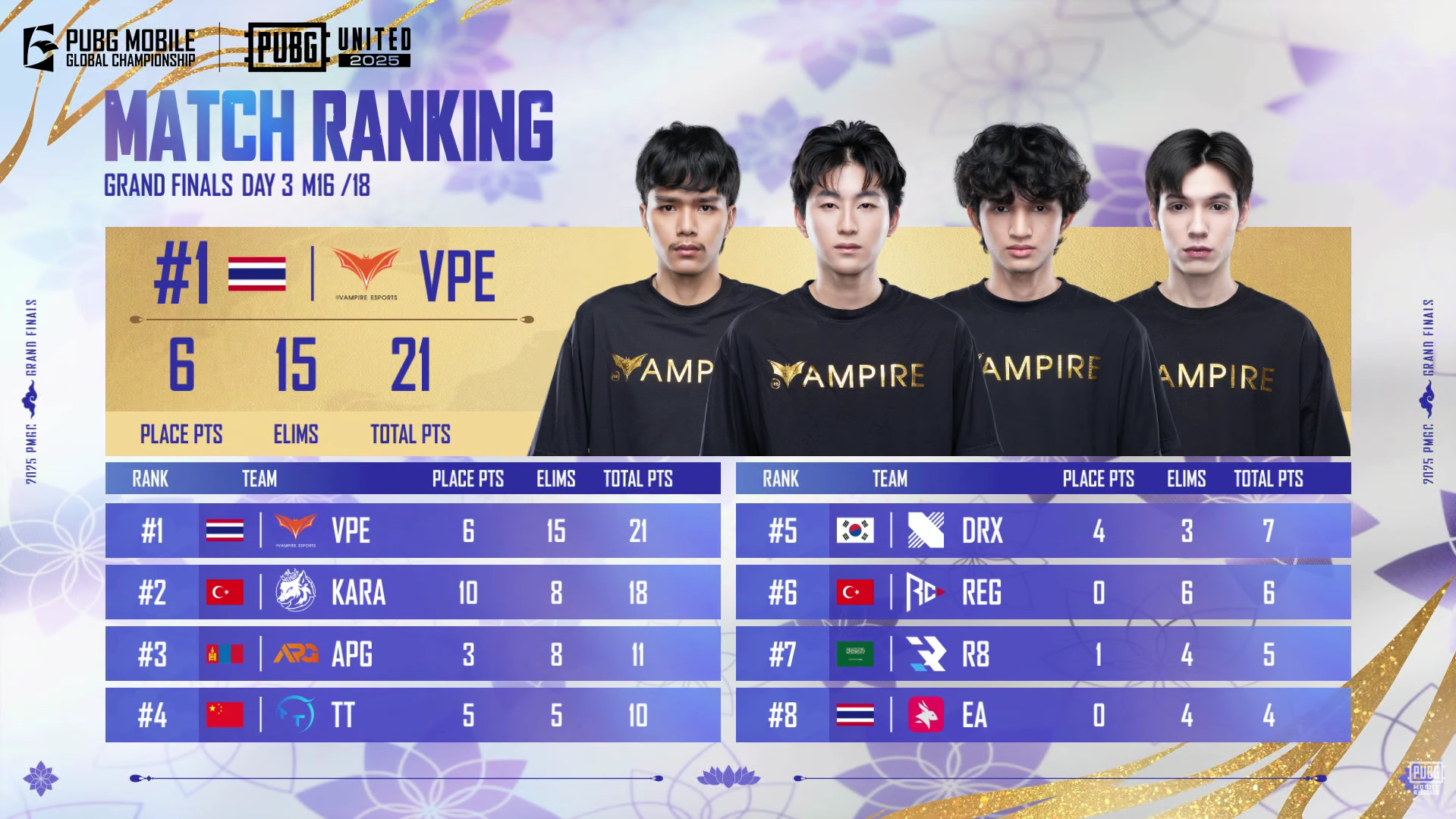 Despite KARA taking the WWCD, Vampire Esports (VPE) finished with the highest total points for the match, securing an enormous 15 elimination points.