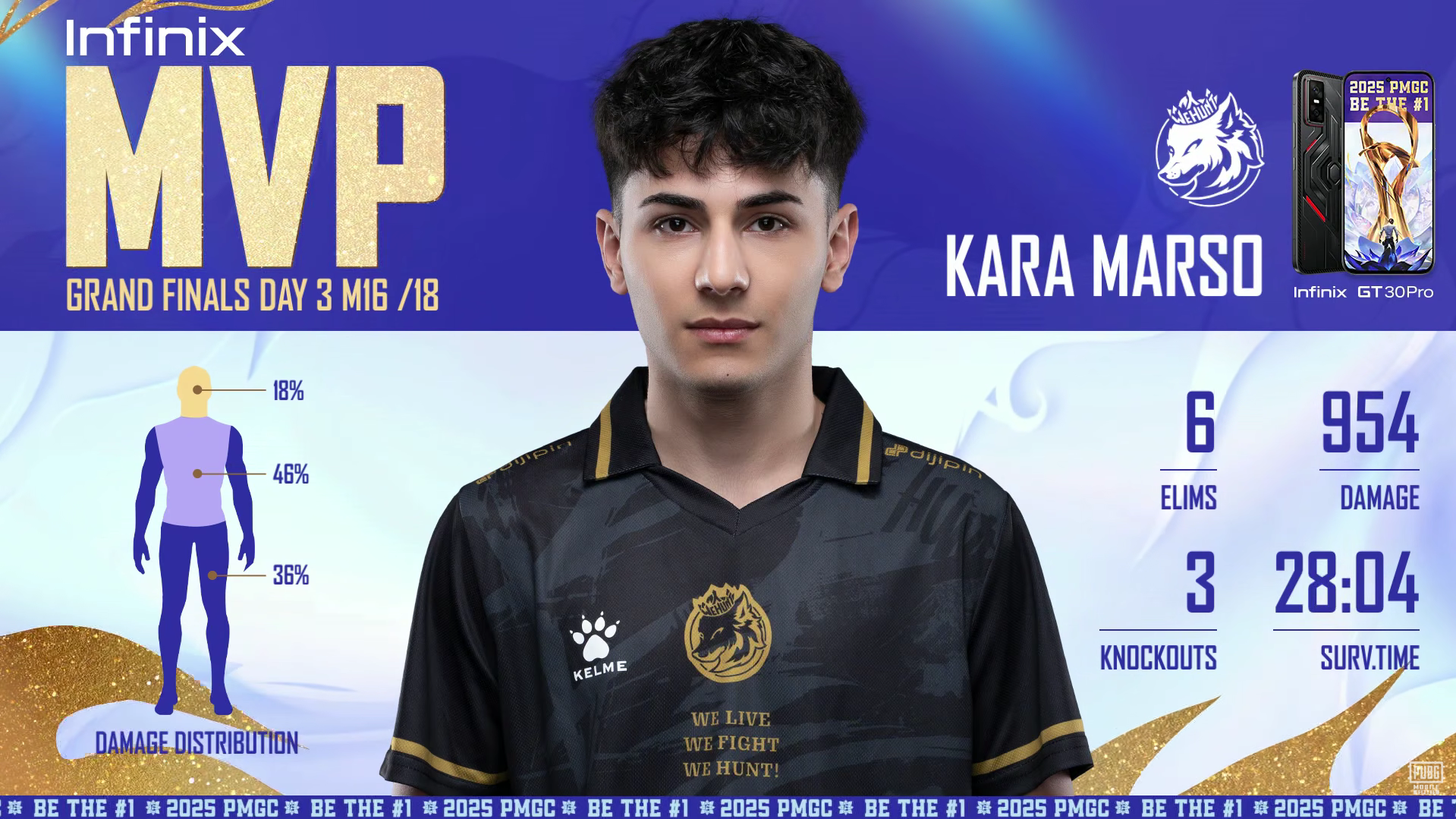 The MVP award for Match 16 went to KARA Marso, whose exceptional damage output was crucial in securing his team's WWCD: