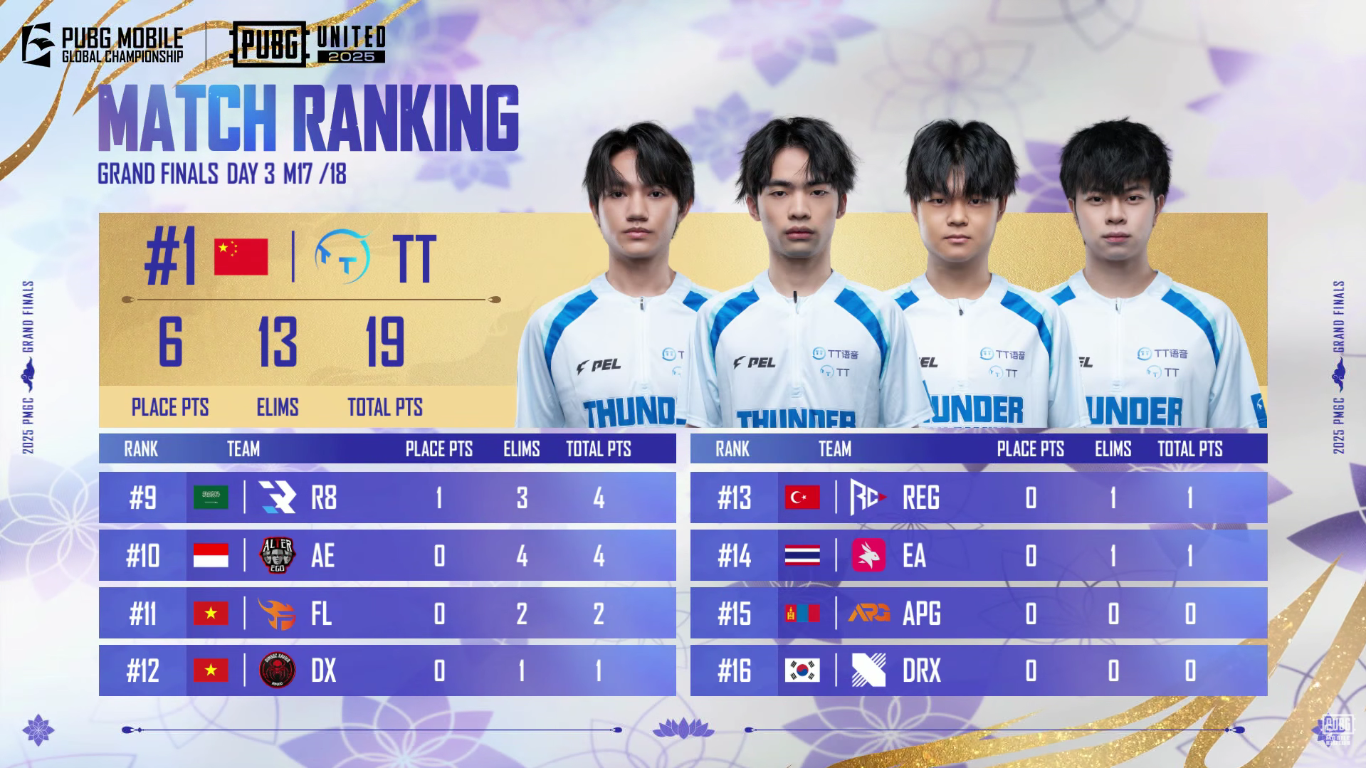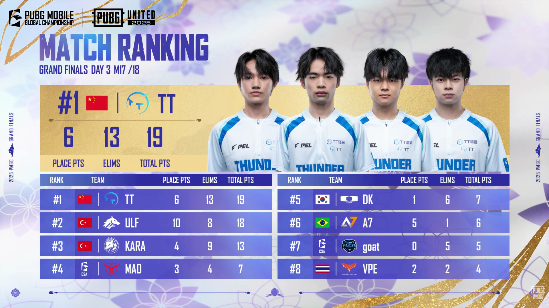 ULF led the match, but ThunderTalk Gaming (TT) and KARA Esports also put up high scores in the late circles: