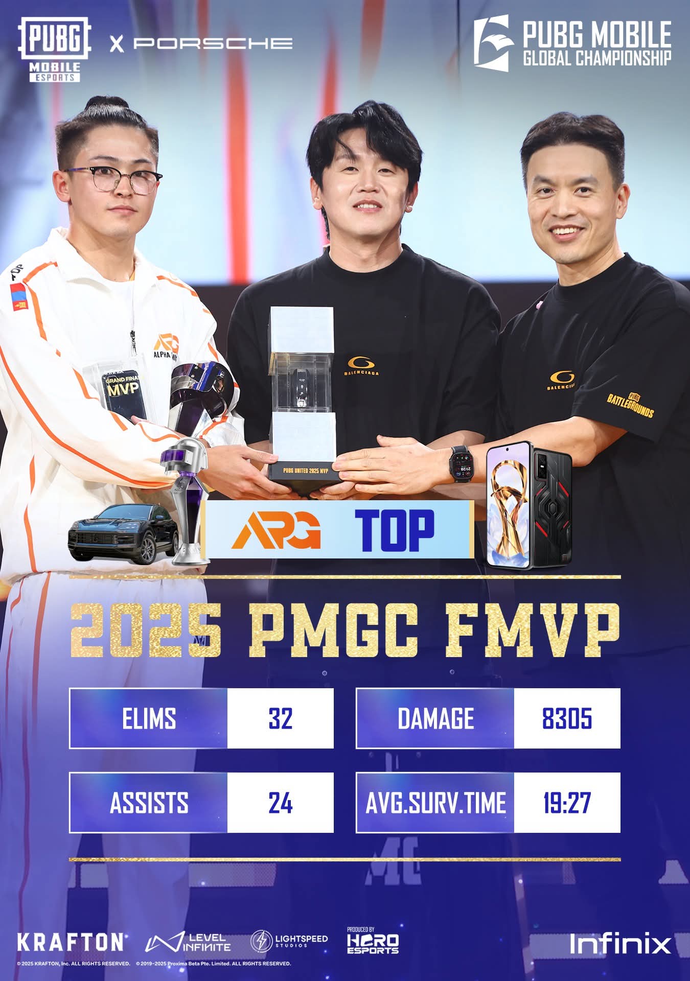 TOP from Alpha Gaming was crowned the PMGC 2025 MVP for his outstanding performance in the Grand Finals. With this achievement, he became the first player in PUBG Mobile history to win the PMGC MVP award twice, having previously won it in 2023. Along with the MVP title, TOP was also rewarded with a brand-new Porsche Cayenne, making his achievement even more special.