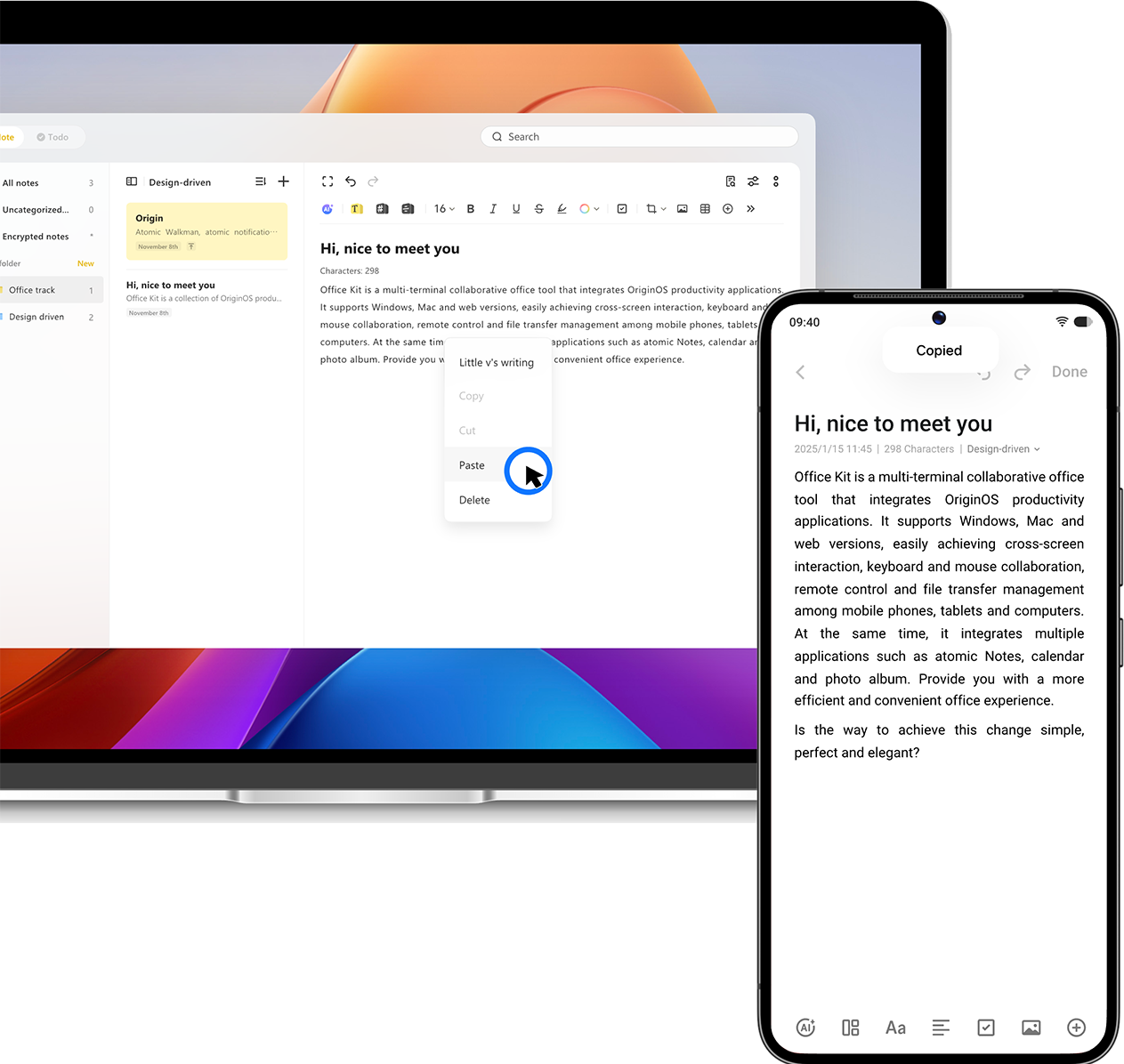 Imagine your phone and your computer sharing the exact same clipboard. That's the magic of Super Clipboard! Once your iQOO phone is connected to your Windows or macOS computer using the Office Kit, you can instantly copy text and images on your phone and directly paste them onto your computer and vice-versa! No more messy transfers, cables, or third-party apps. It’s seamless, fast, and super efficient!