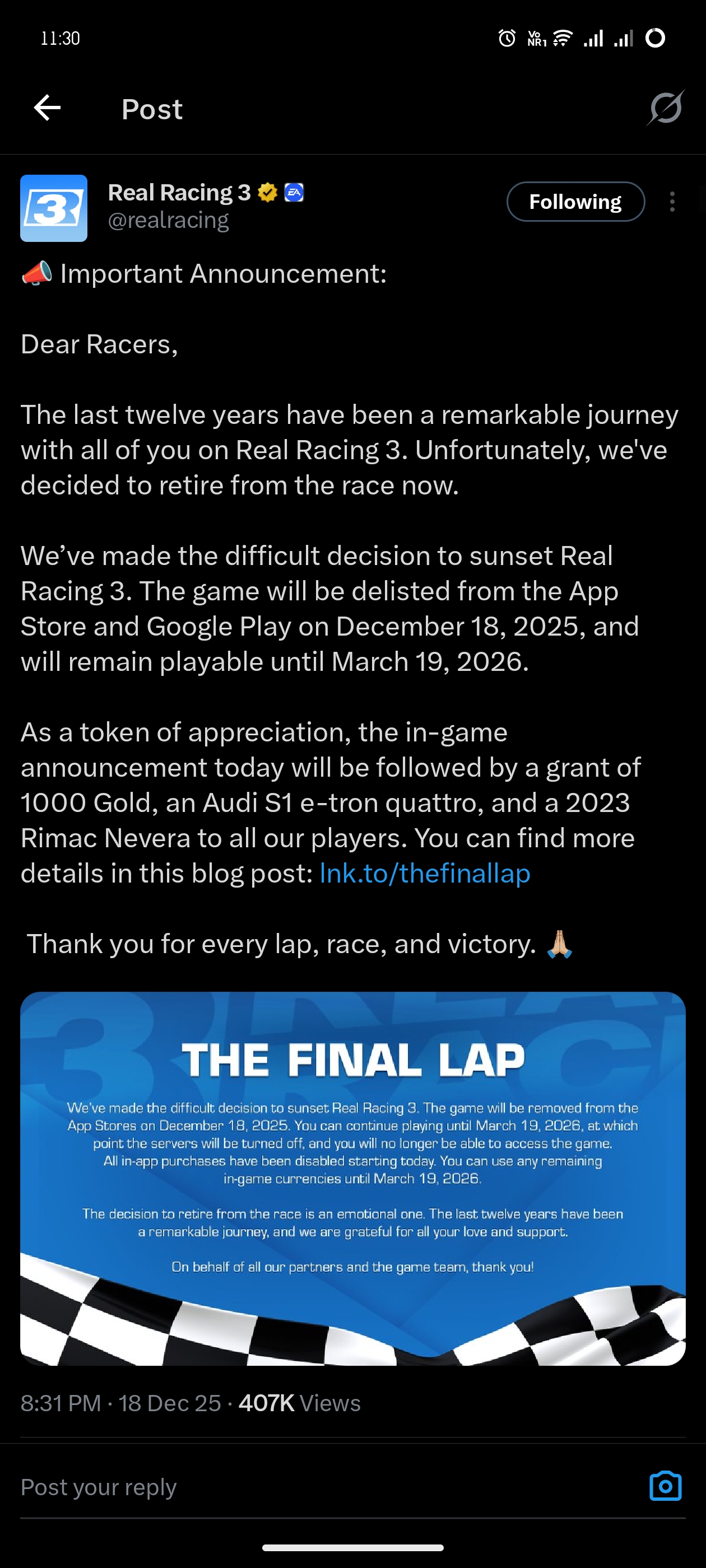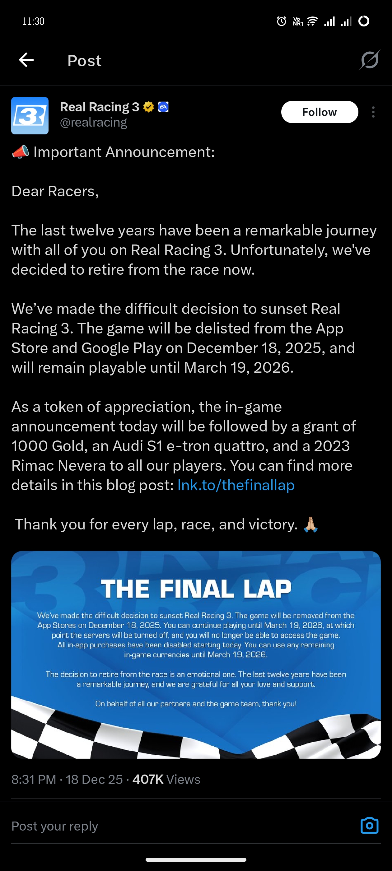 On December 18, 2025, Electronic Arts (EA) formally declared the end of Real Racing 3 after an amazing 12-year run.