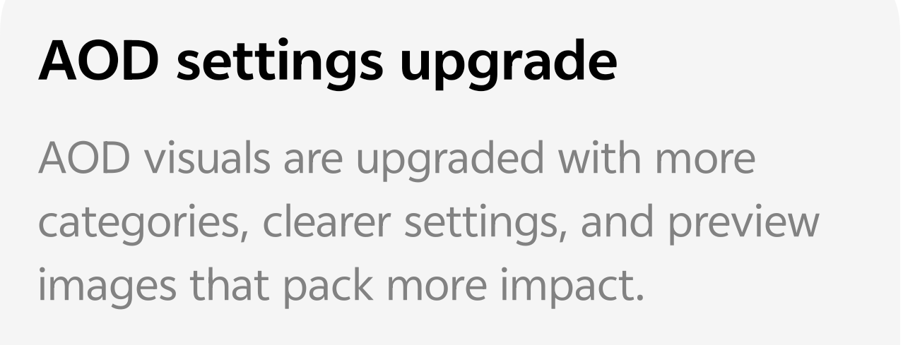 The AOD interface has been redesigned to be more intuitive and visually stunning. Here’s what you can look forward to: