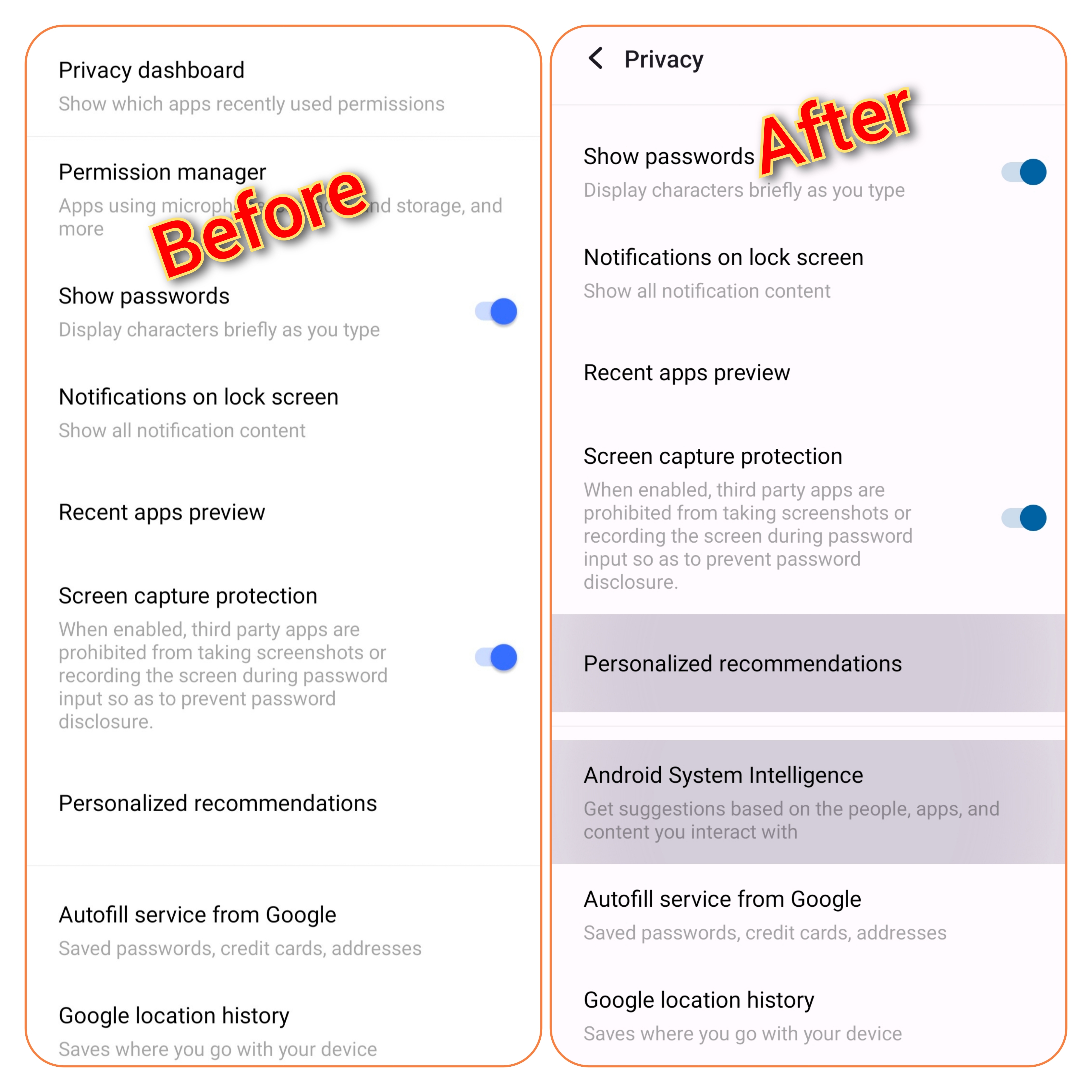 In the privacy section couple of key features added. One is now you can share pictures without granting apps access to whole media . And another " Android System Intelligence " feature added.
