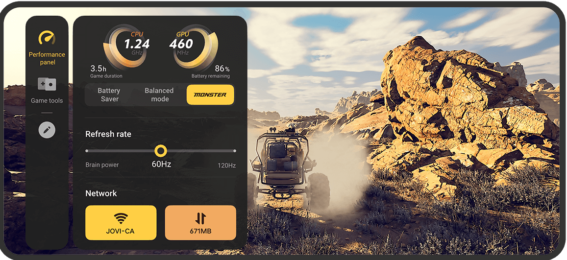 * Performance Monitoring: Quickly toggle between Battery Saver, Balanced, and Monster Mode to boost your FPS.