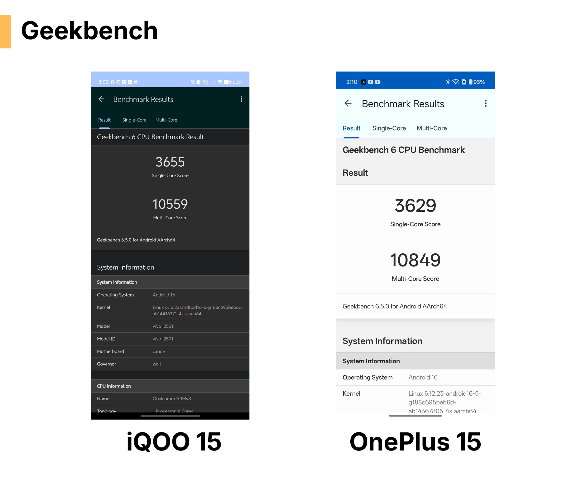 iQOO 15's Single Core Performance is Higher but OnePlus 15 goes an inch higher in the Multi-Core score. This means, both the smartphones are equally same.