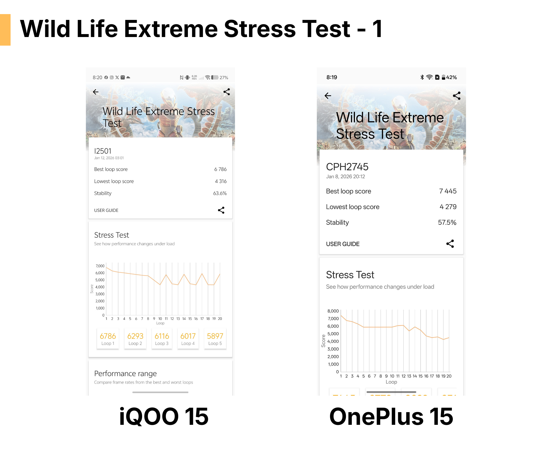 iQOO Clearly wins this test by showing 63.6% Stabilty whereas OnePlus 15 looses with 57.5% Stability.