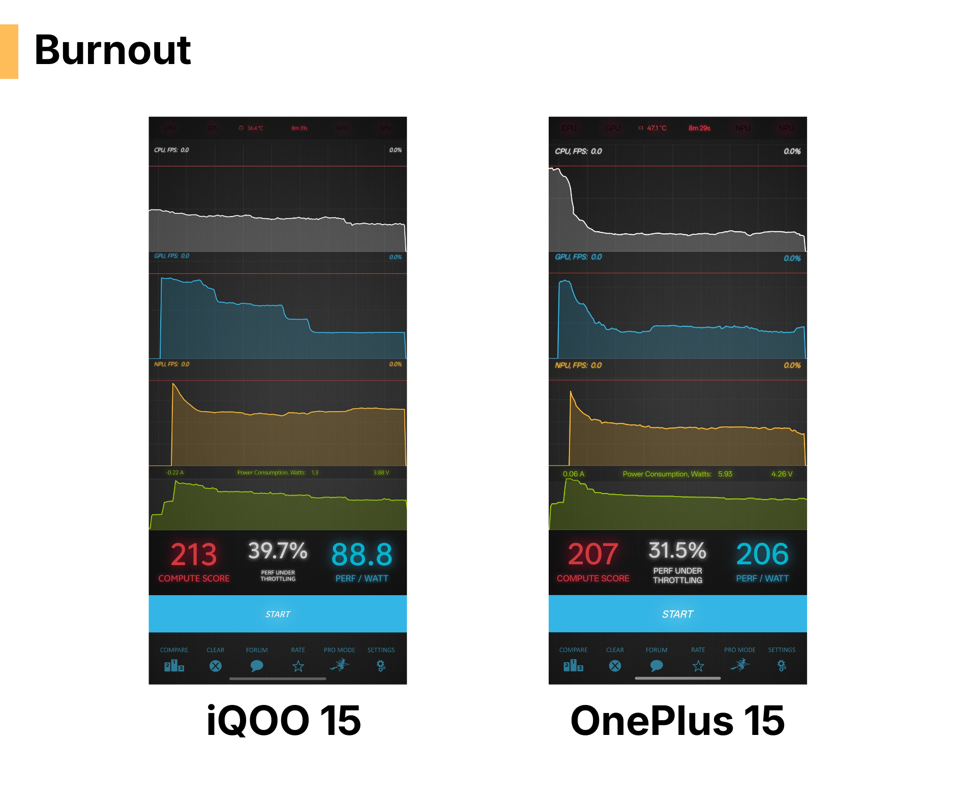 In the Burnout again, iQOO 15 clearly emerges as the Winner with higher Compute Score, Higher performance againts throttling, and Lower wattage.