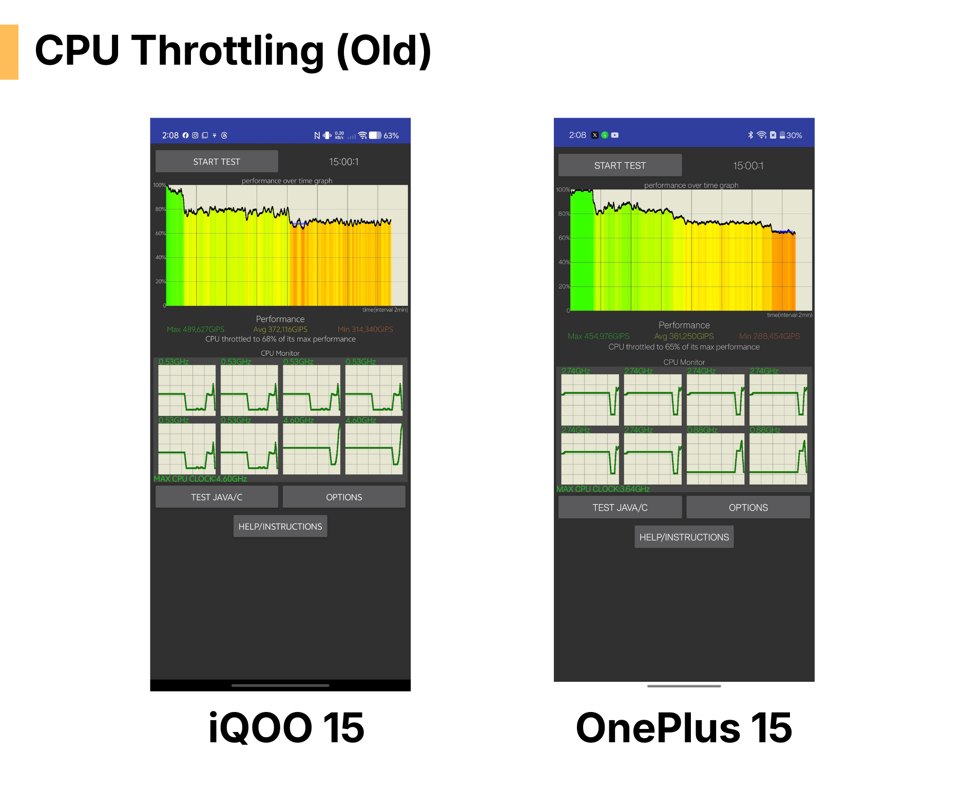 Here, we can easily see that both of the Smartphones sustained almost same performance but the iQOO 15's Average GIPS score is higher than the OnePlus.