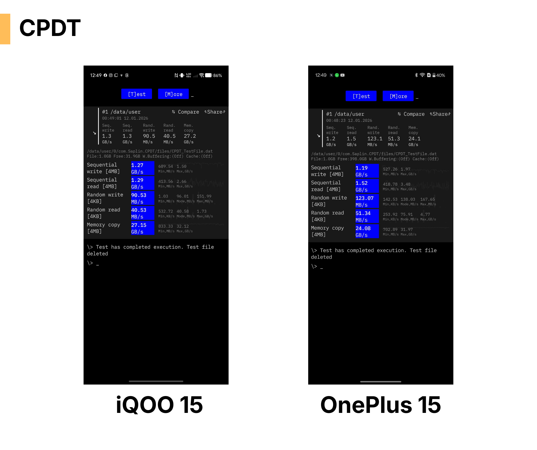 First of all, I have been using the iQOO 15 since a long time, and the Storage was 75% occupied out of 512GB but the OnePlus 15 was empty. And, Apart from all the specs OnePlus 15 has a little toned up RAM type so you might notice variations on storage speeds which is not noticeable in real life usecase.