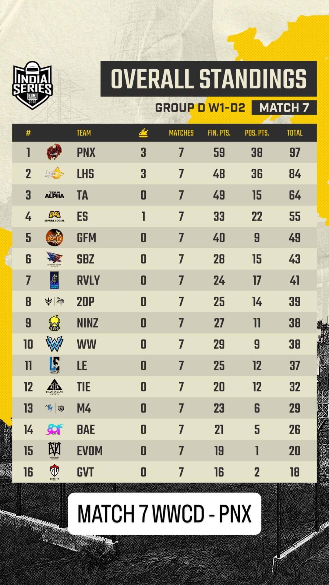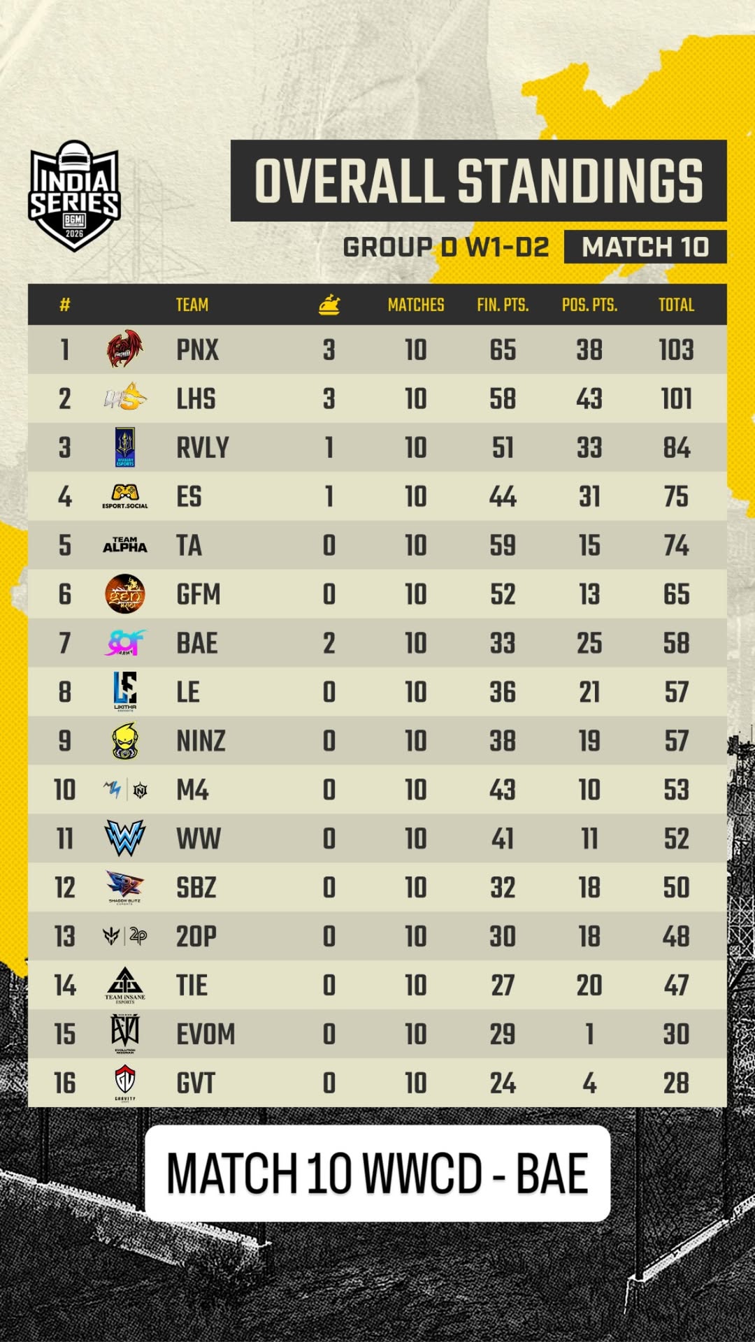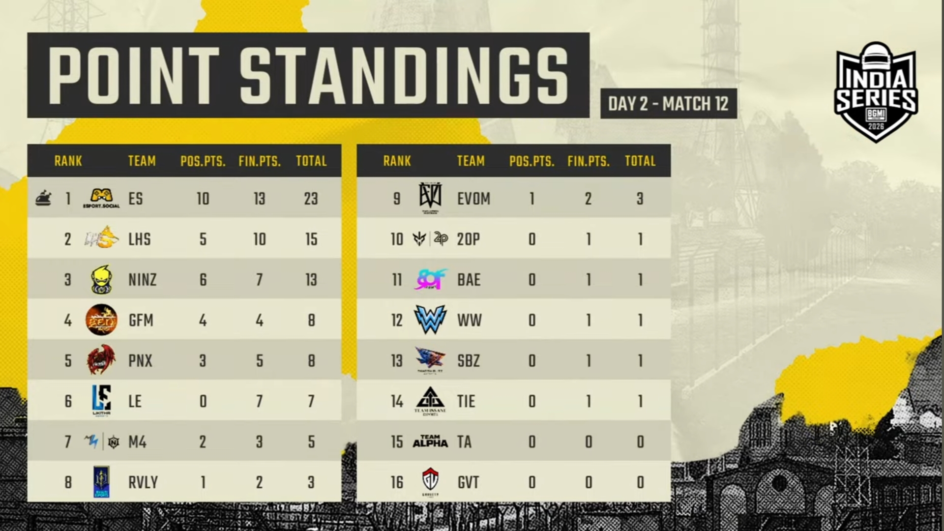 Rivalry and Team Alpha ranked fourth and fifth with 89 and 79 points, respectively. Genxfm finished sixth with 74 points, while Meta Ninza, led by BGMI star Shadow, ranked seventh with 70 points. Likitha placed eighth with 68 points, while Bot Army and 2OP each collected 62 points. Evolution and Gravity came 15th and 16th, with 45 points and 31 points, respectively.