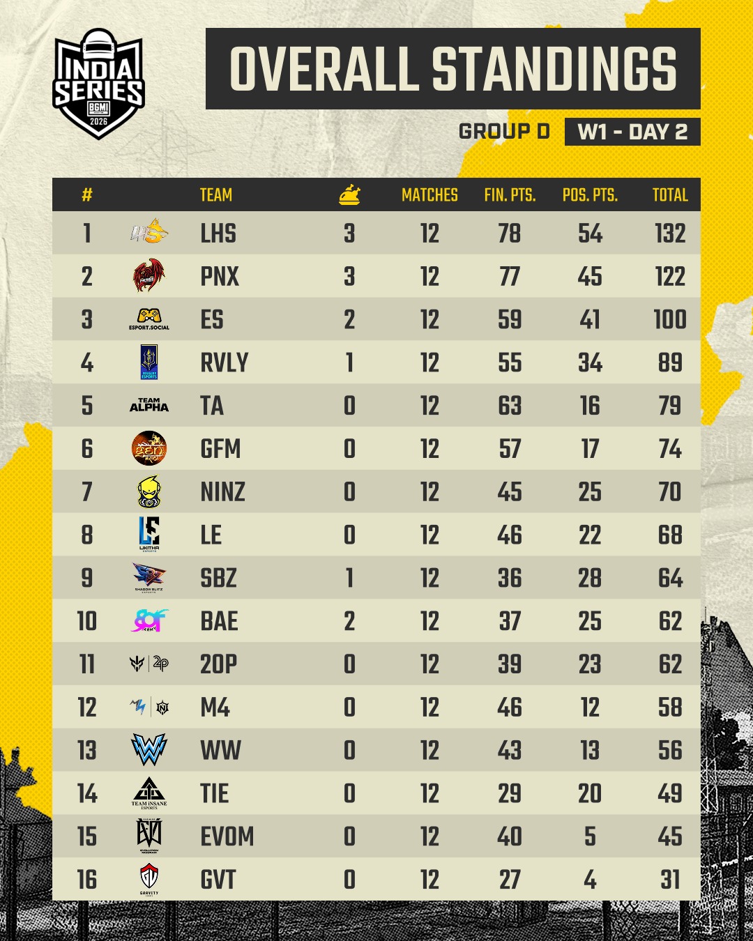 Day 2 of the BGIS 2026 The Grind took place on January 18. Group D has played 12 matches in the first two days of the event. LHS remained in the prime spot in the overall standings with 132 points and three Chicken Dinners. Phoenix came second with 122 points and three Chicken Dinners, while Esports Social improved their performance on Day 2 and jumped to third place with 100 points.