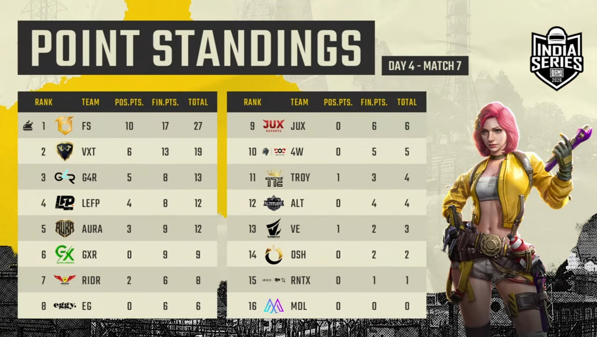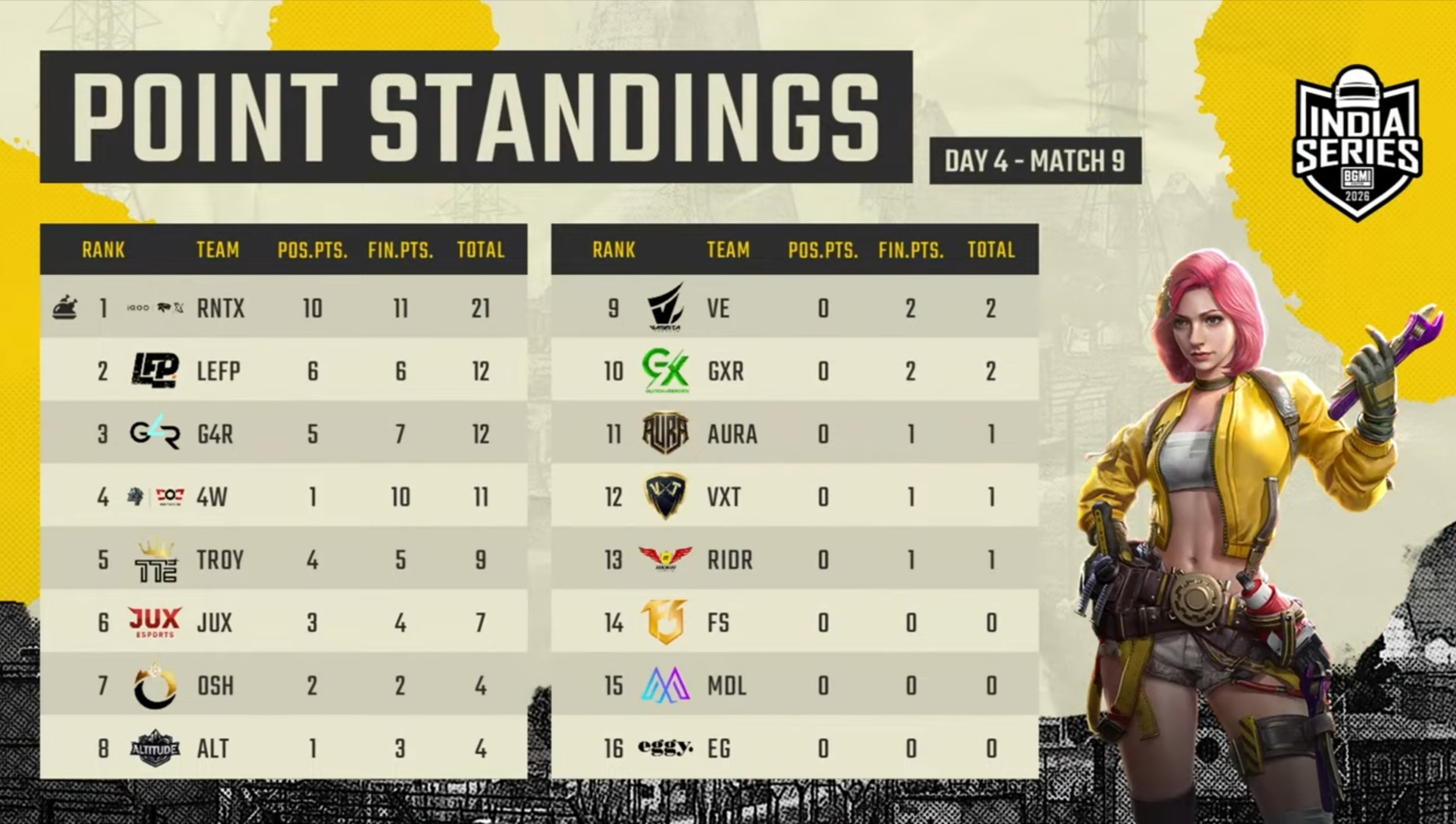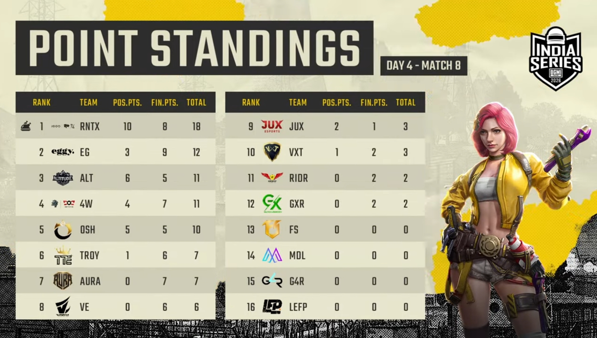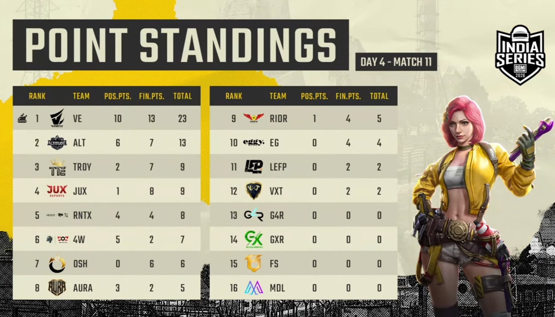 Rider came 13th with 55 points and one Chicken Dinner. OSH ranked 14th with 46 points. GlitchxReborn has accumulated 28 points, including 24 eliminations. Medal had another terrible day as the team failed to score a single point in six matches on Day 4. The team came in 16th with only 11 points.