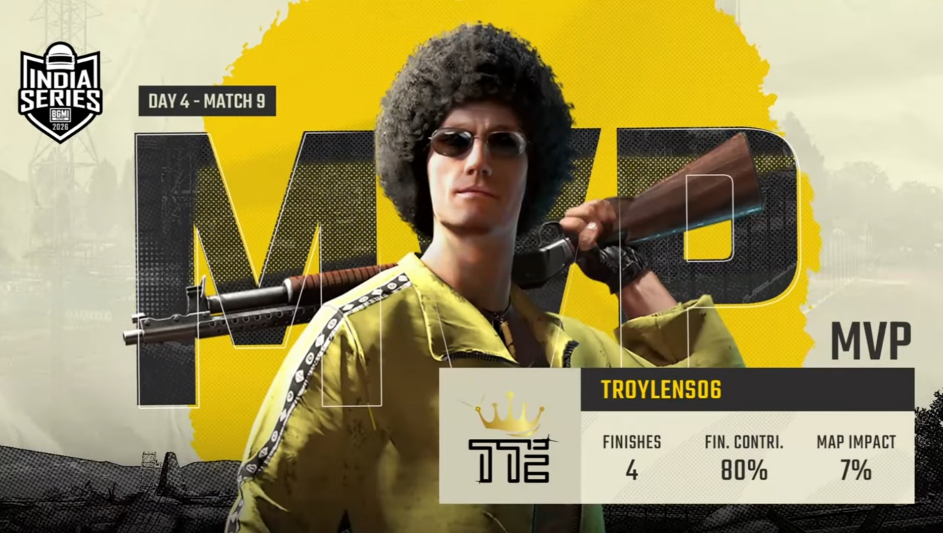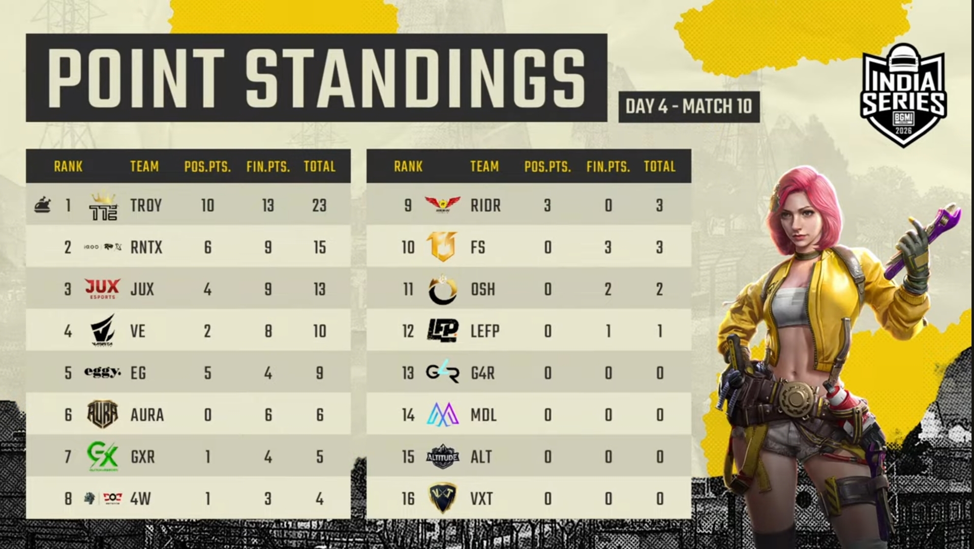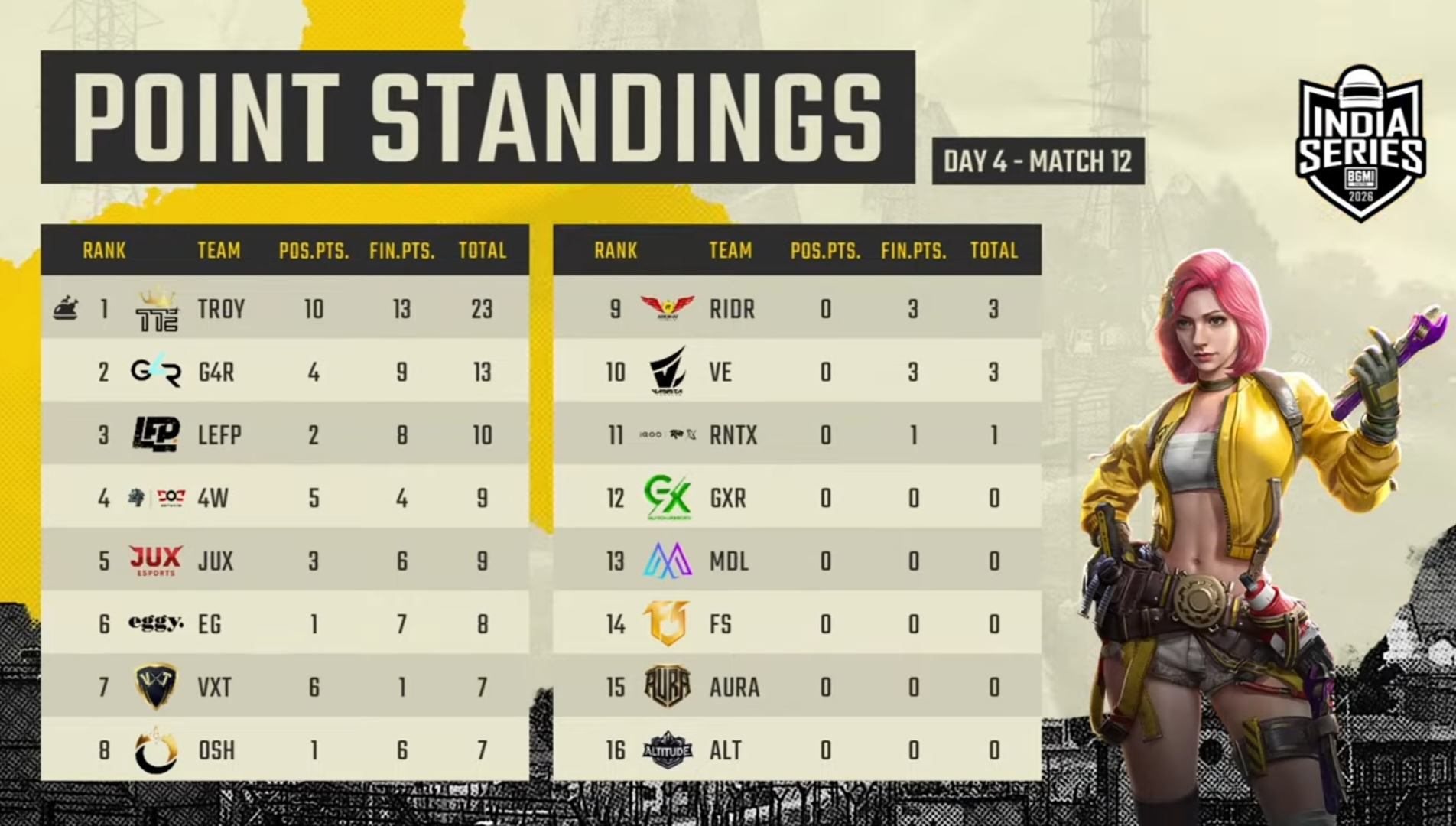 Troy acquired a 23-point Chicken Dinner in the last match of Day 4 of the BGIS 2026 The Grind. God For Reason secured 13 points, including nine kills. LEFP added 10 important points to its name. 4Wolf and JUX secured nine points each, and Team Eggy netted eight points.