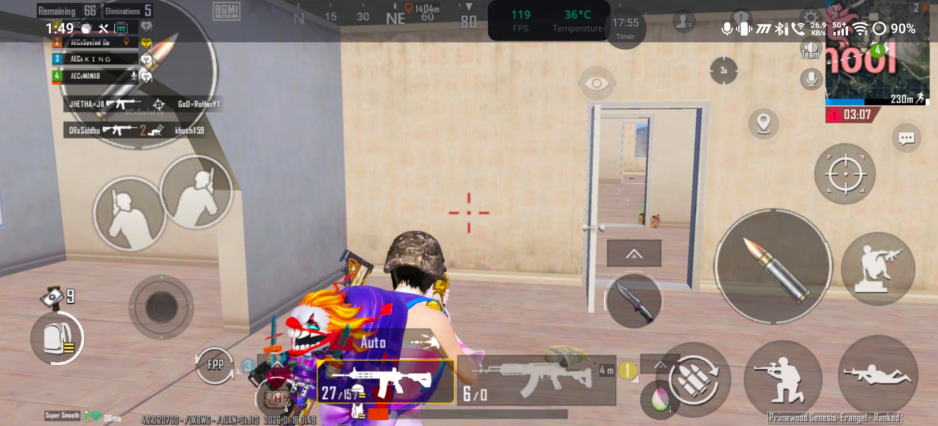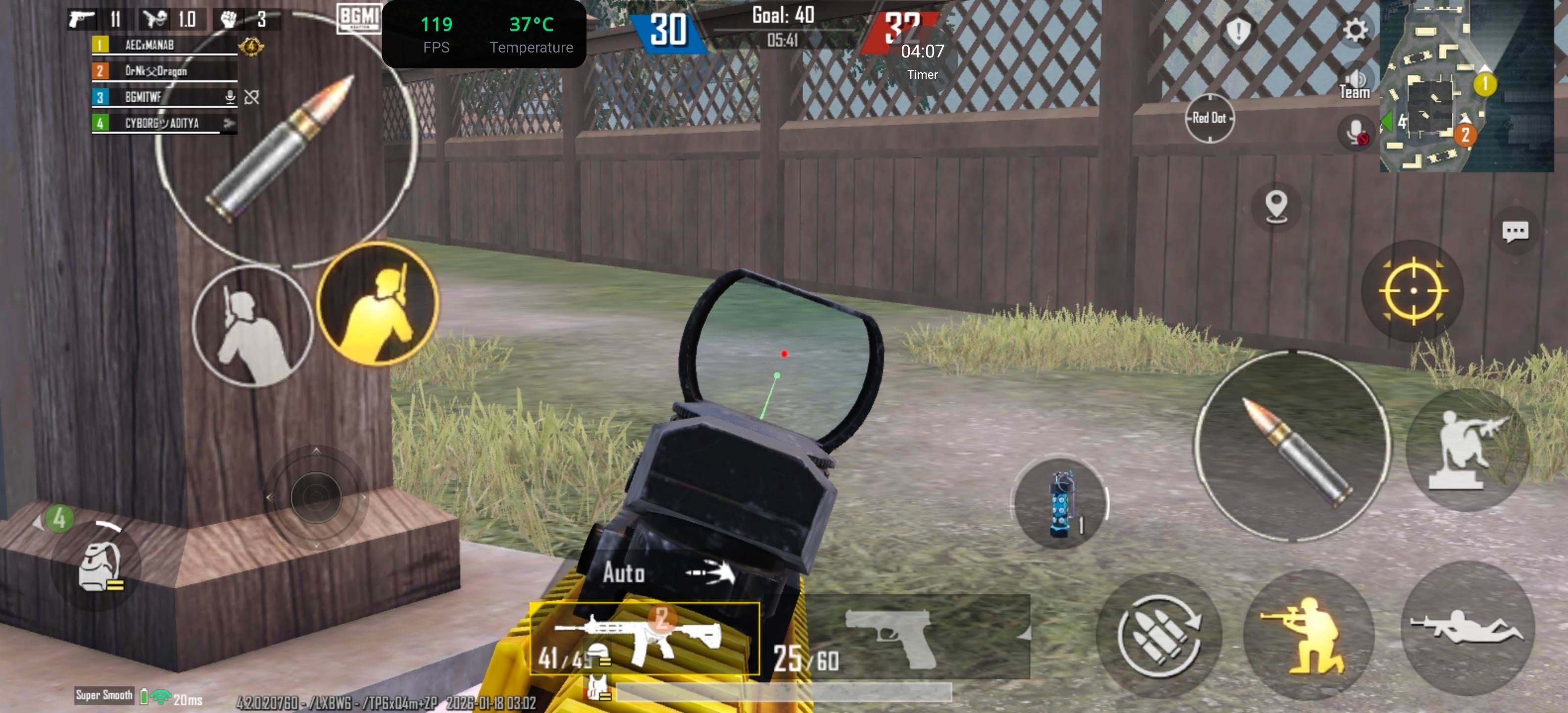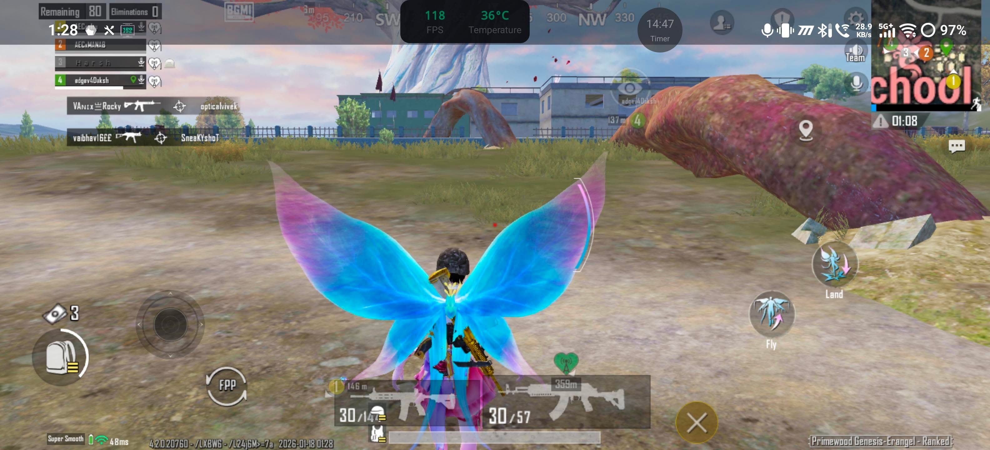 We started the first match on Erangel with my squad, and you can see the FPS meter and device temperature on the top of the screen.