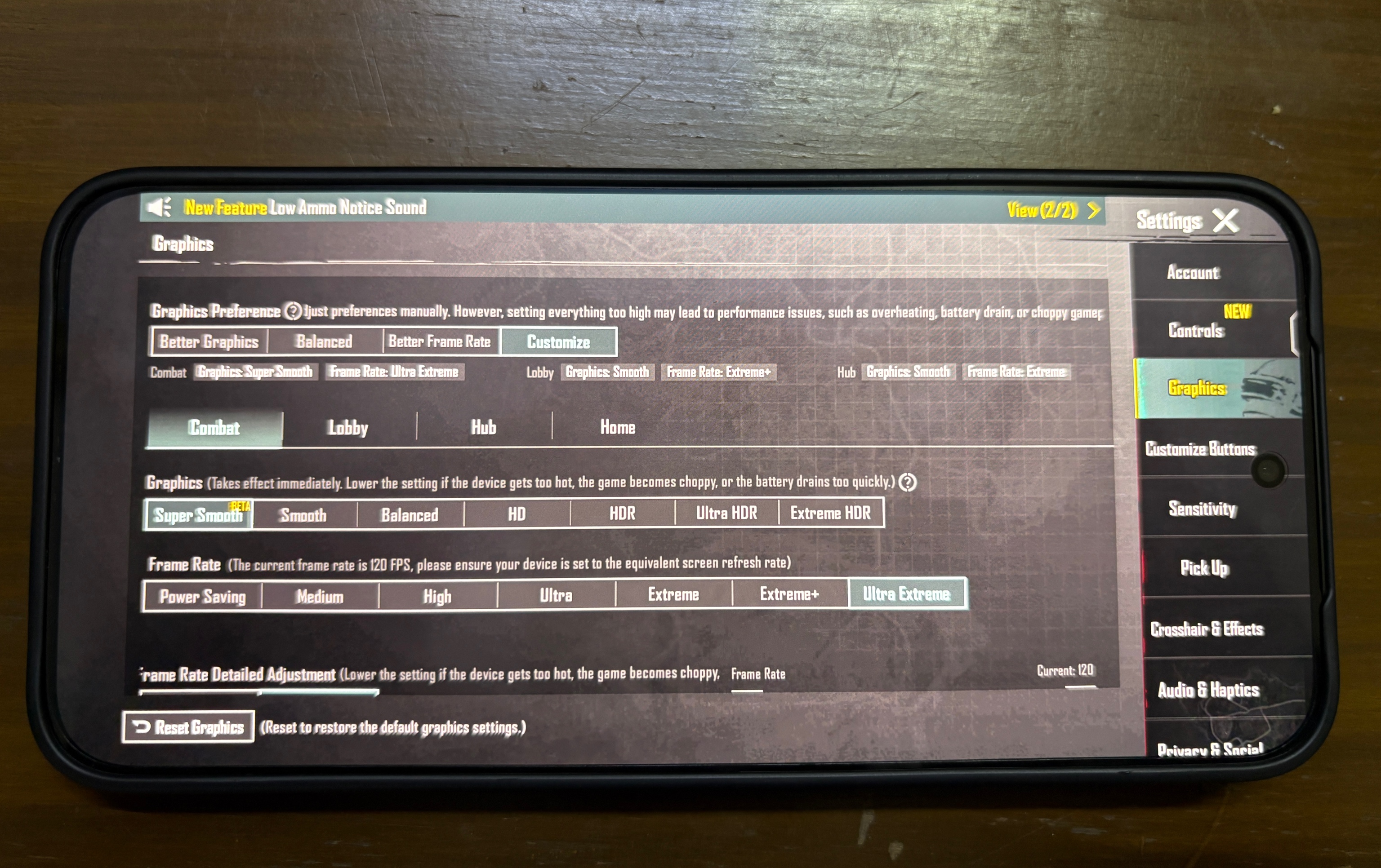 I have kept the settings on Smooth + Ultra Extreme (120 FPS), which is the highest available in BGMI on this device.