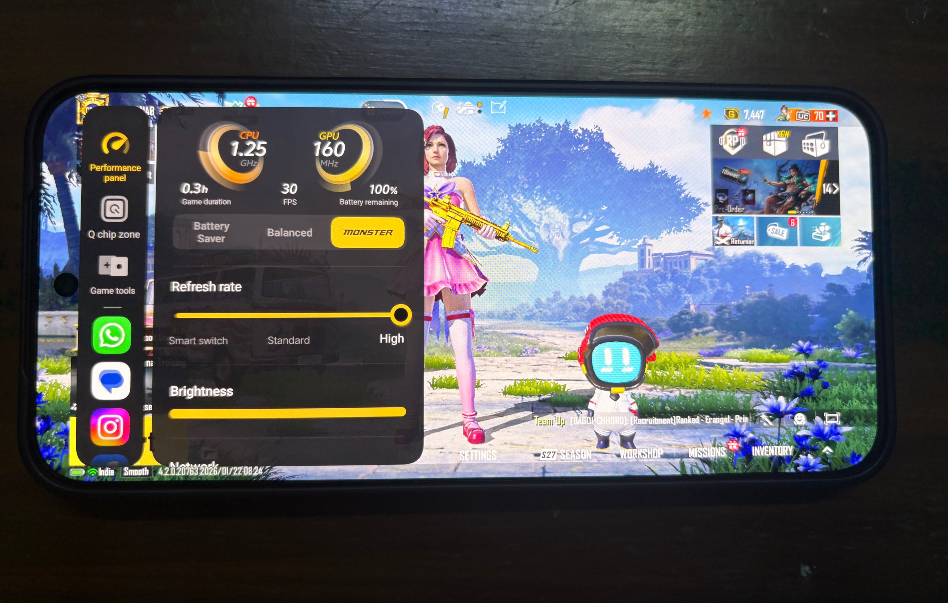 Monster Mode is ON, and both refresh rate and touch sampling rate are set to high for best performance.Now lets see how stable and smooth the gameplay stays during the test.