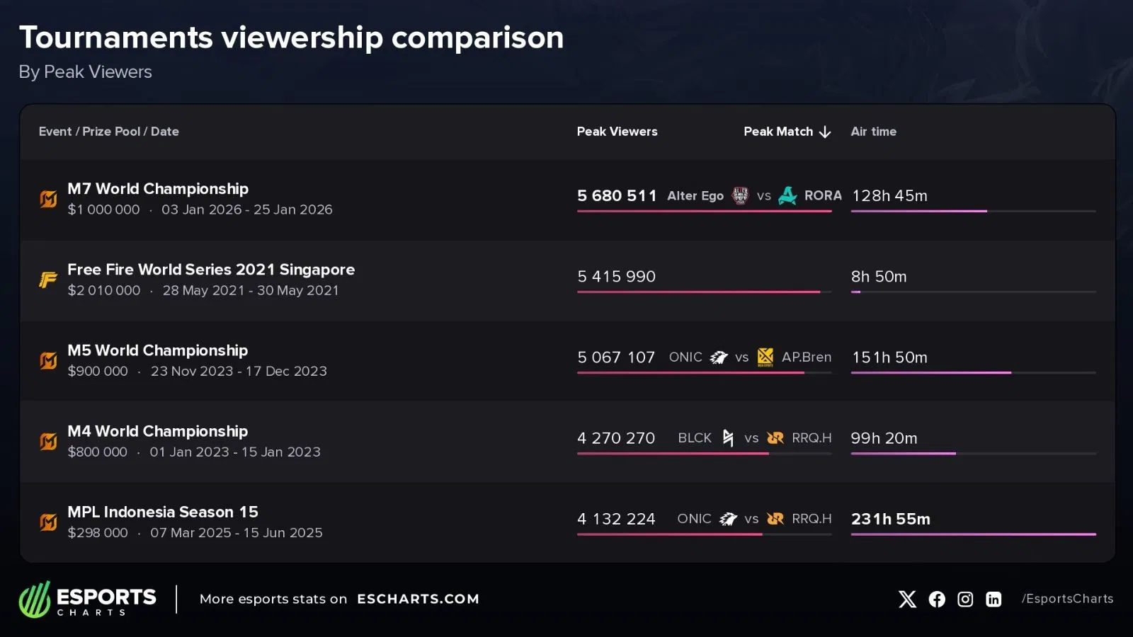 According to Esports Charts, the Grand Finals between Aurora Gaming PH and Indonesia’s Alter Ego peaked at more than 5.68 million concurrent viewers, with strong performance across Indonesian, Tagalog and Malaysian language broadcasts, as well as TikTok Live.
