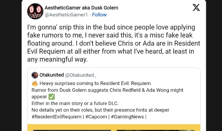 Responding to a rumor that falsely accredited him as the source, Resident Evil leaker Dusk Golem has shut down a "fake leak" that claimed Ada Wong and Chris Redfield would be appearing in Resident Evil Requiem. Dusk Golem clearly stated that he does not believe "Chris or Ada are in Resident Evil Requiem at all...at least in any meaningful way." Responding to follow-up questions, he reminded fans that Requiem's director has already spoken in an official capacity in stating Chris would not be in the game, though Dusk Golem acknowledged the possibility of Chris or Ada being mentioned in a file or similar off-handed reference or Easter egg. While Dusk Golem has mentioned "murmurs" of an older Resident Evil character making a surprise appearance in a potential Resident Evil Requiem DLC, he remains adamant that neither Ada nor Chris will appear in Requiem "from what [he's] heard."