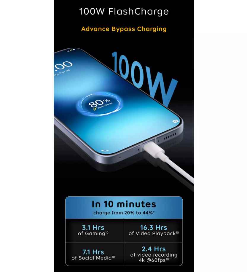 Battery capacity is only half the story in modern smartphones. Charging speed and charging efficiency have become equally important, especially for users who rely heavily on gaming, content creation, and multitasking. The iQOO 15R introduces 100W FlashCharge with Advanced Bypass Charging, designed to deliver fast, efficient, and intelligent power management.