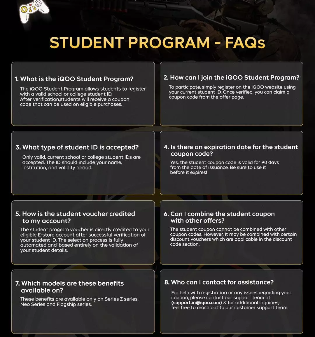 The benefits under the Student Program vary by product category. Students can get ₹300 off on Z Series, ₹1000 off on Neo Series, and ₹1000 off on Flagship Series smartphones. These coupons are valid for a fixed period after issuance and can be redeemed only on eligible devices listed on the iQOO E-Store. The student coupon cannot be transferred, cannot be exchanged for cash, and can be used only once per student.