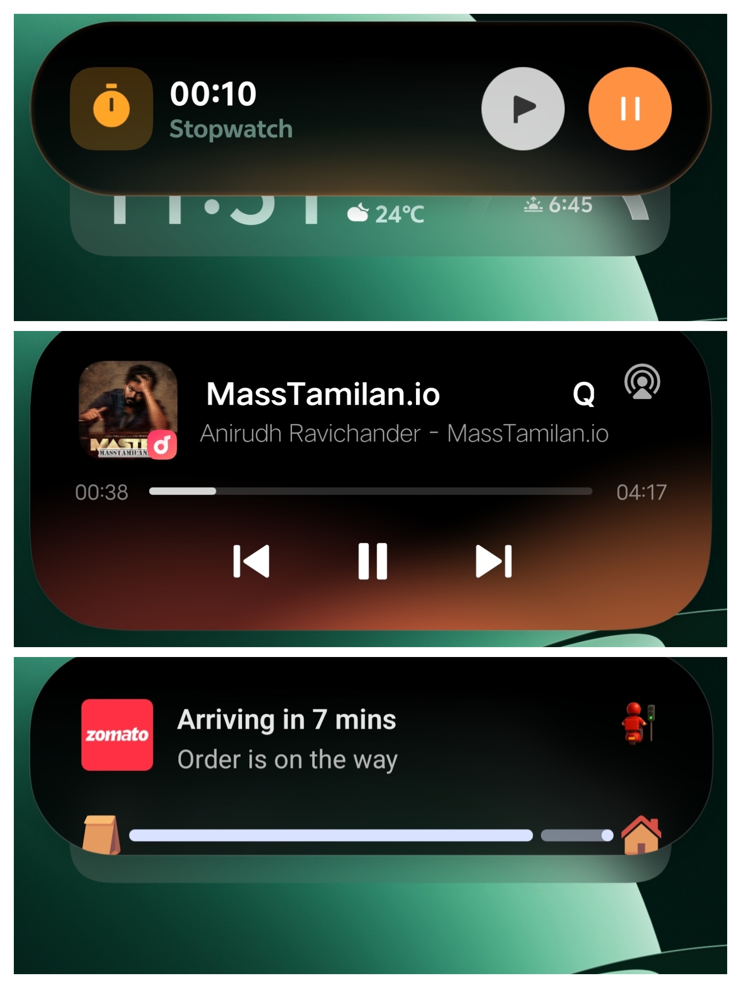 What makes it practical is how it works with system services and third-party apps. You can enable services like music controls, hotspot status, device cloning progress, sport tracking, and game countdown timers - all accessible through Origin Island. It even works seamlessly with apps like Zomato, showing real-time order updates without switching apps.