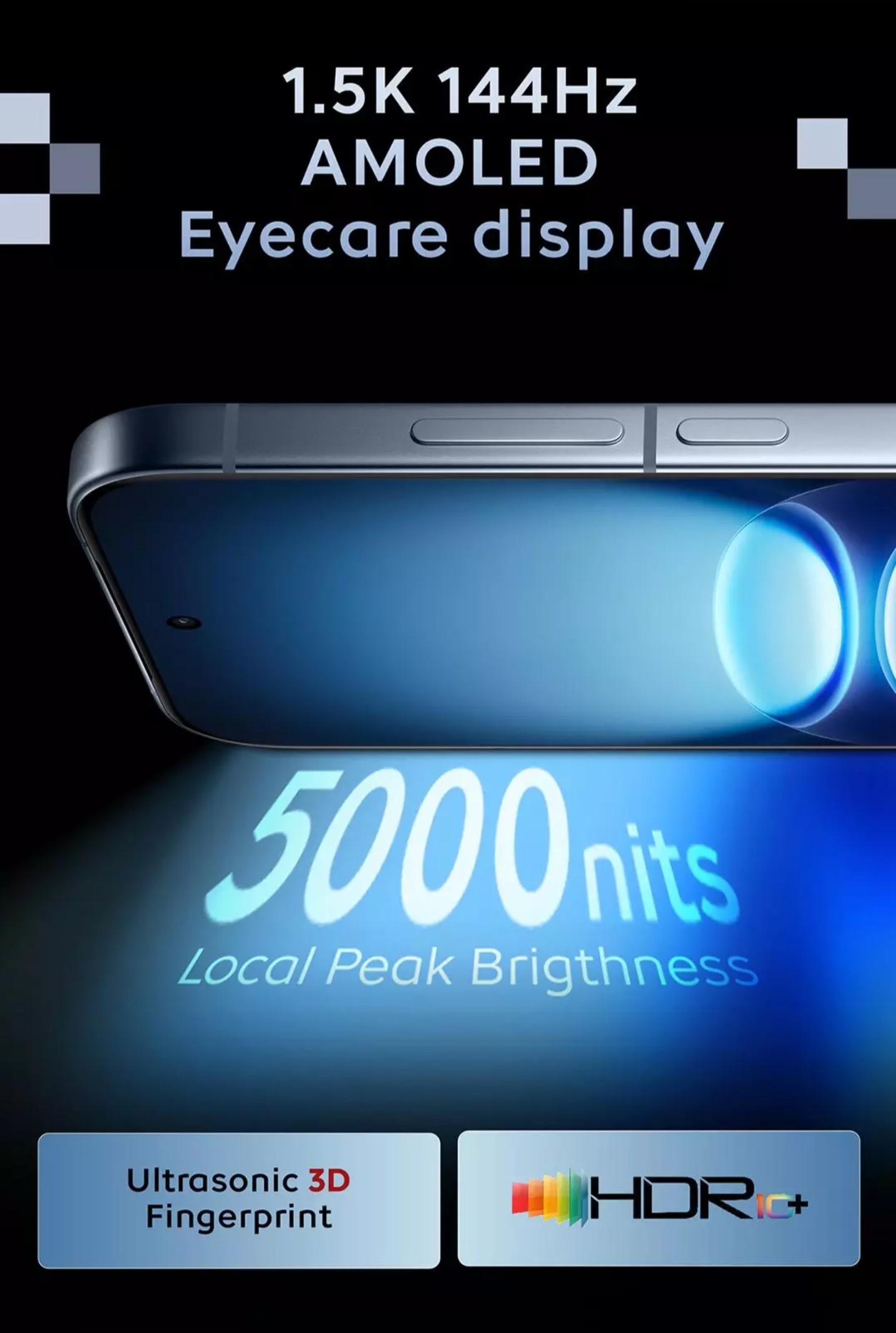 The iQOO 15R comes with a 1.5K 144Hz AMOLED Eye Care display built for smooth visuals and high brightness.