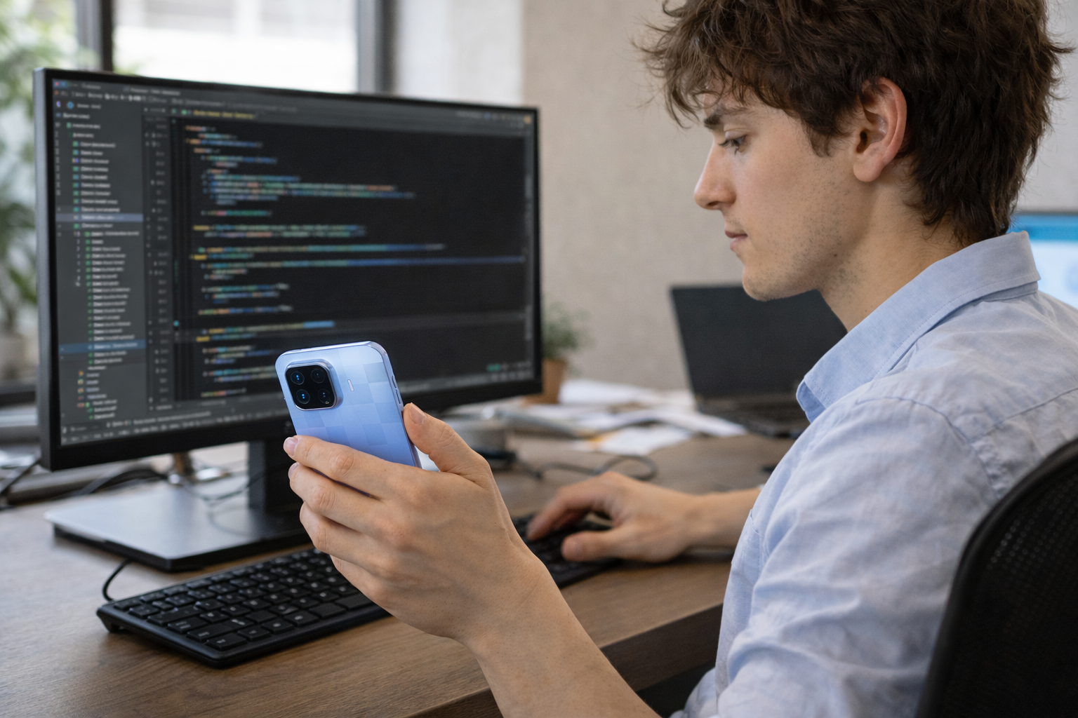 Left hand – phone Right hand – laptop mouse or typing.