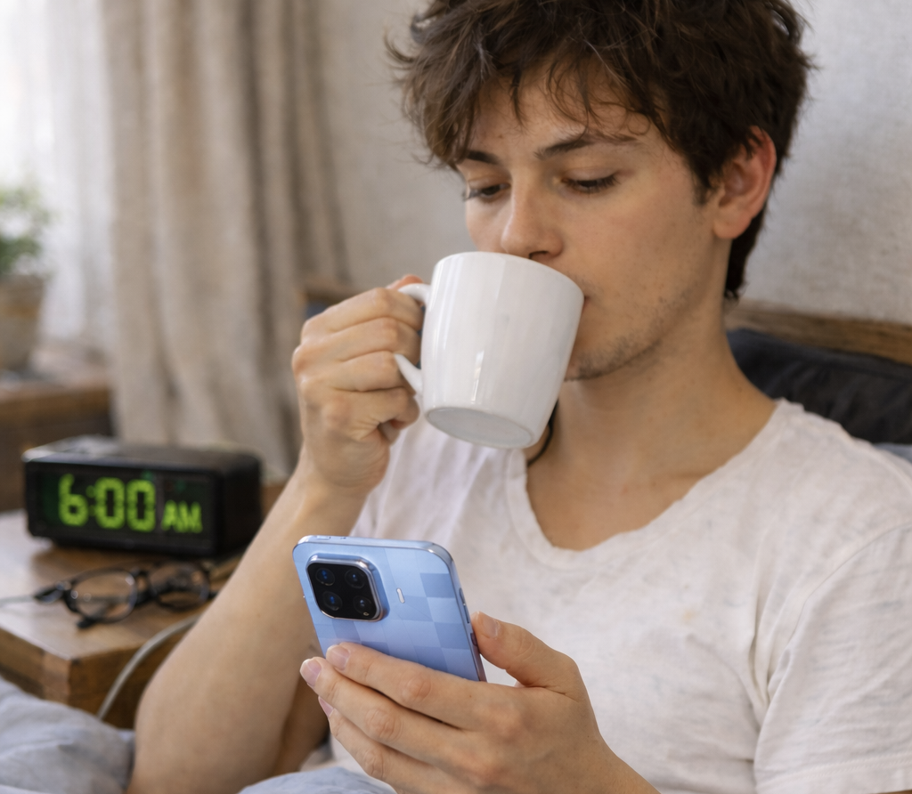 Morning 7 AM. You wake up. Coffee in your right hand Phone in your left hand.